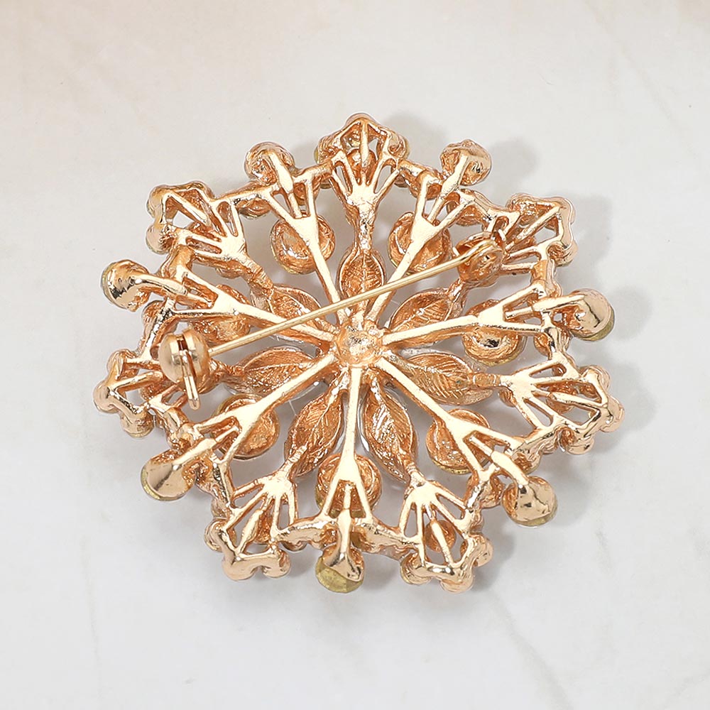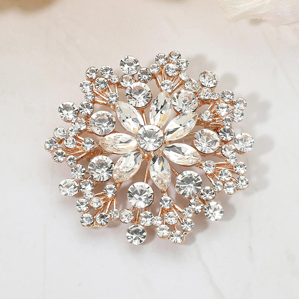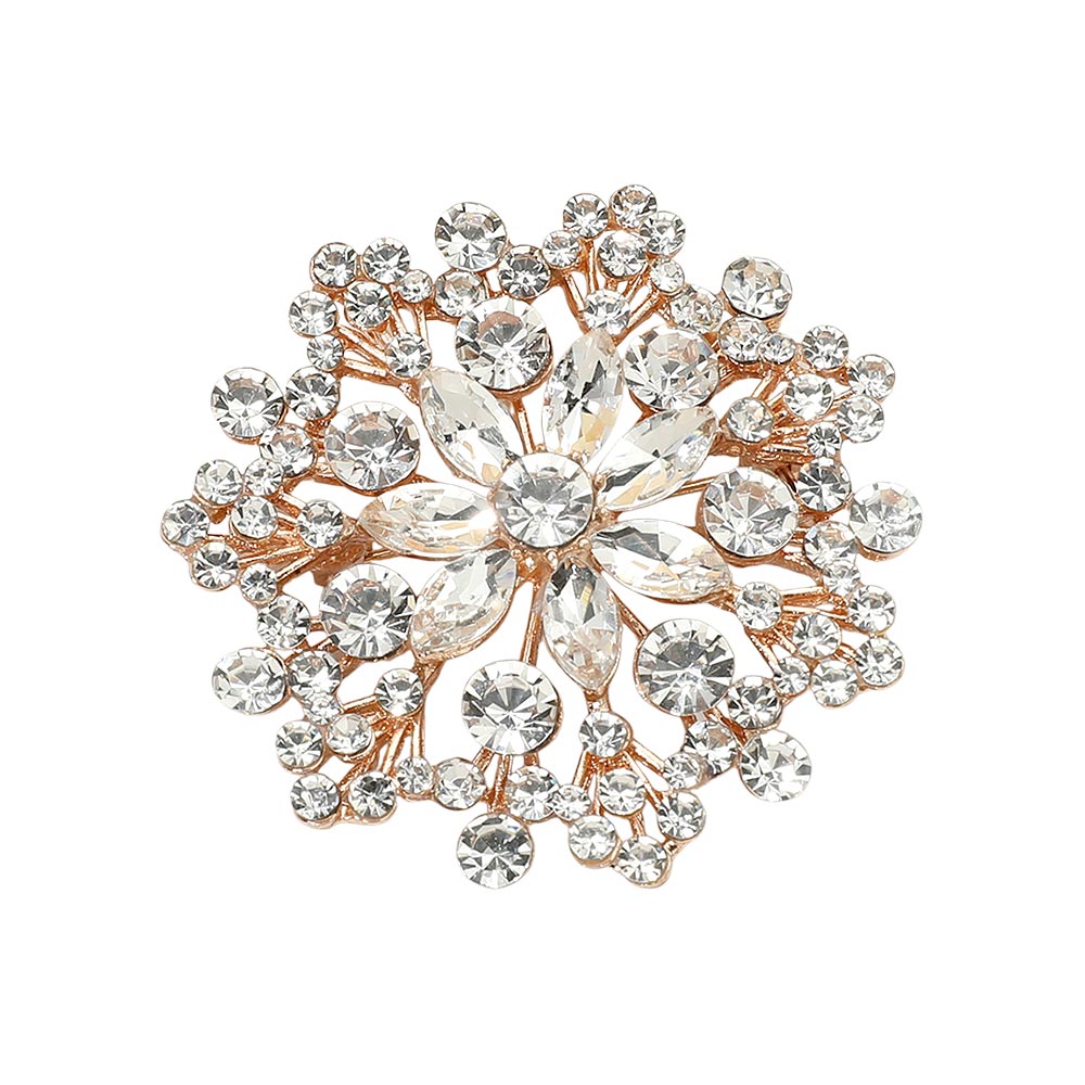 Details • Size : 2" X 2" • Pin Brooch • Eye-catching floral statement brooch designed with layered crystal accents arranged in a radiant cluster silhouette. This decorative pin adds elegant sparkle and dimension to jackets, scarves, dresses, and accessories, making it ideal for formal styling, seasonal collections, and fashion-forward displays. • Lead and Nickel Compliant