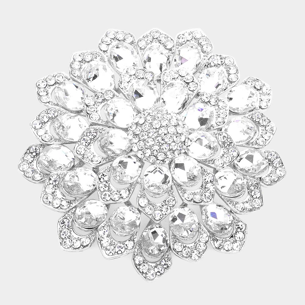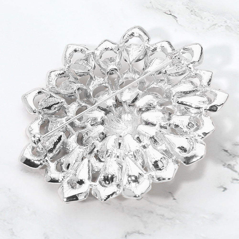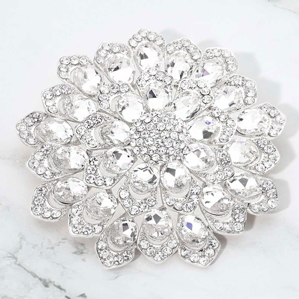 Details • Size : 3.1" X 3.1" • Pin Brooch • Stunning floral brooch designed with layered petals and iridescent crystal gemstones. Perfect as a statement accessory for dresses, scarves, shawls, or special occasions, adding sparkle and elegance to any outfit. • Lead and Nickel Compliant