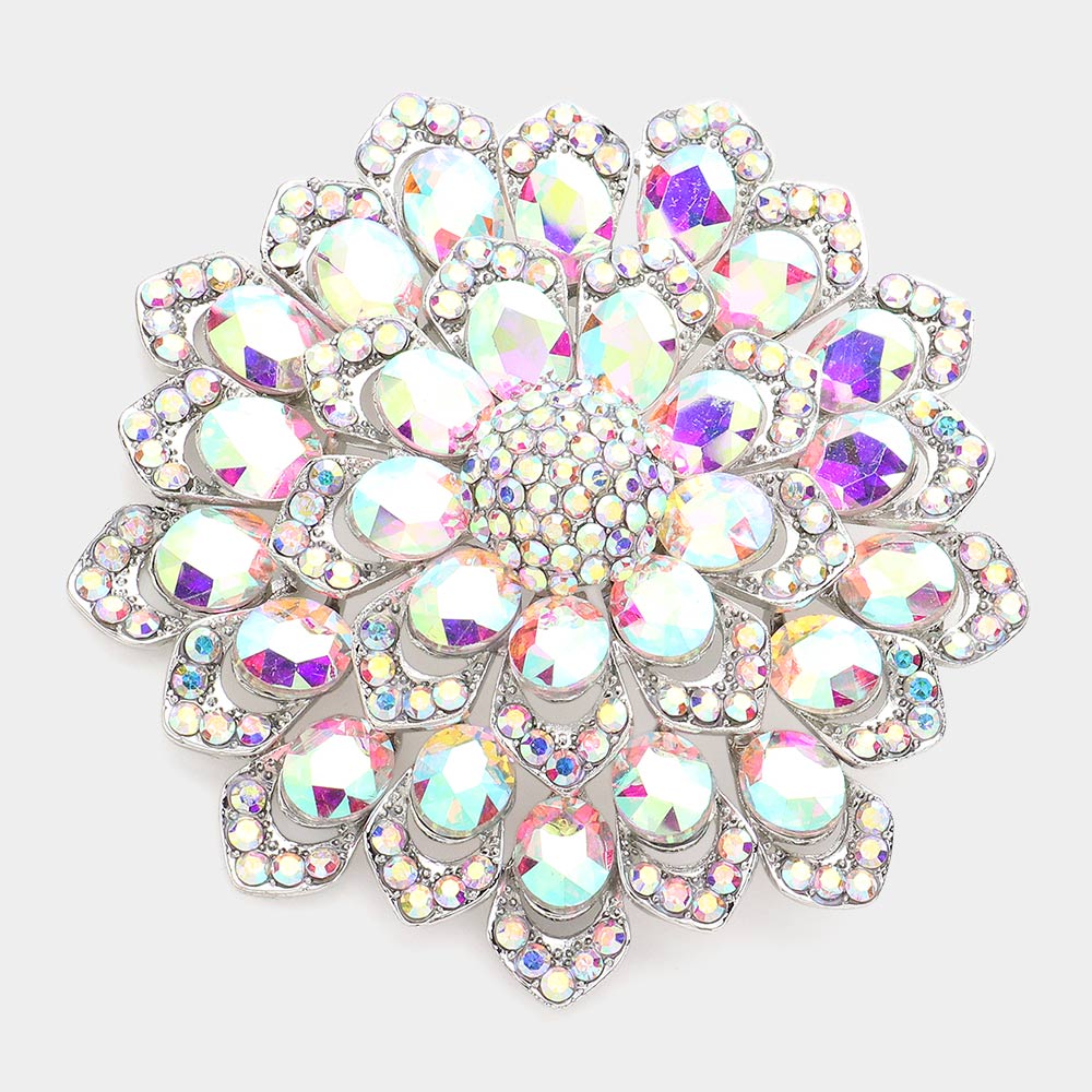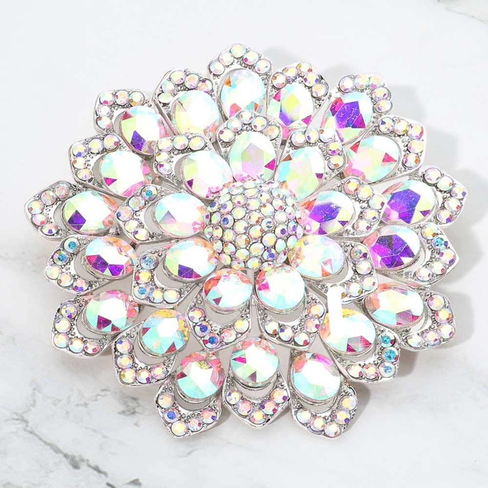 Details • Size : 3.1" X 3.1" • Pin Brooch • Stunning floral brooch designed with layered petals and iridescent crystal gemstones. Perfect as a statement accessory for dresses, scarves, shawls, or special occasions, adding sparkle and elegance to any outfit. • Lead and Nickel Compliant