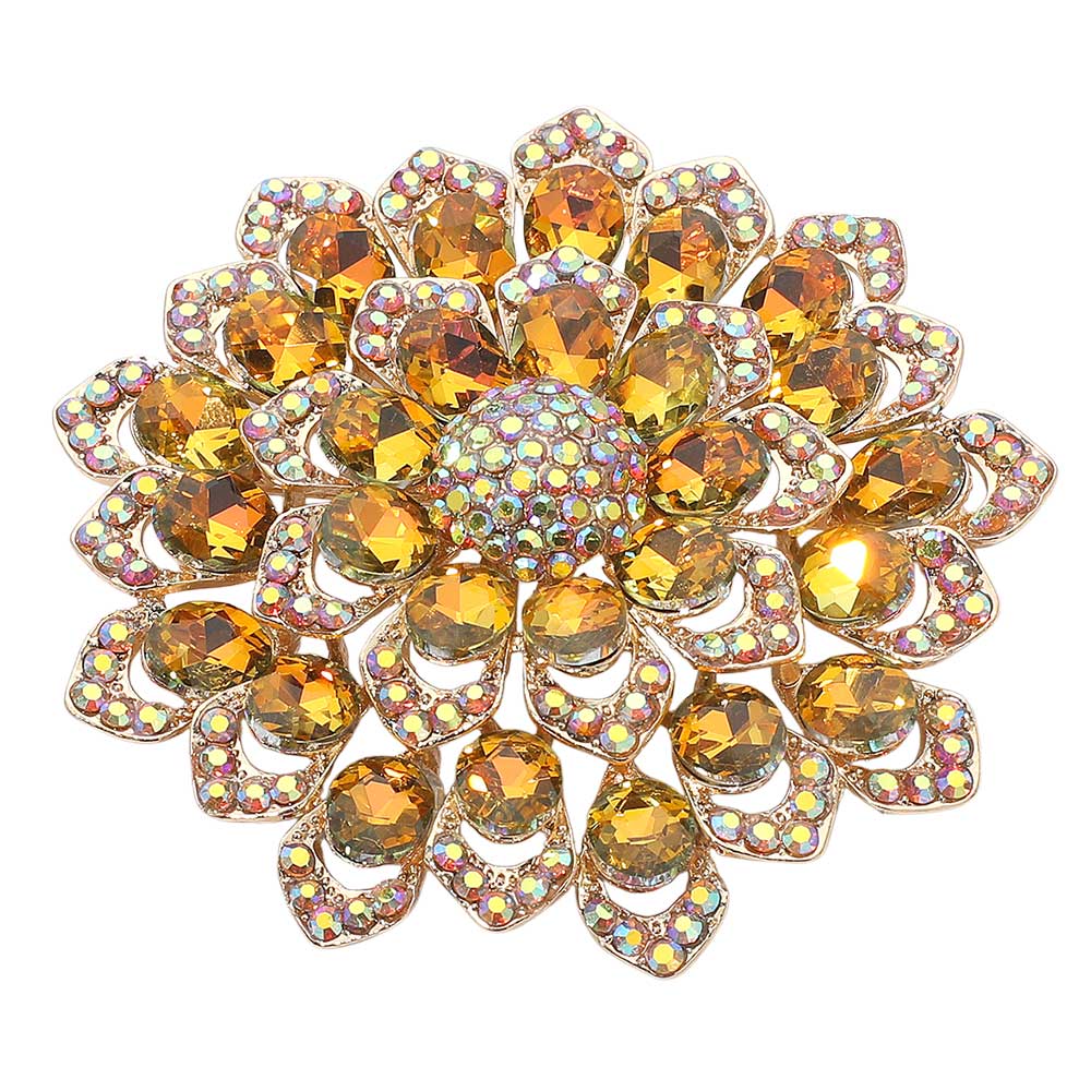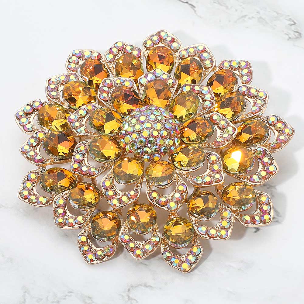 • Stunning floral brooch designed with layered petals and iridescent crystal gemstones. Perfect as a statement accessory for dresses, scarves, shawls, or special occasions, adding sparkle and elegance to any outfit.