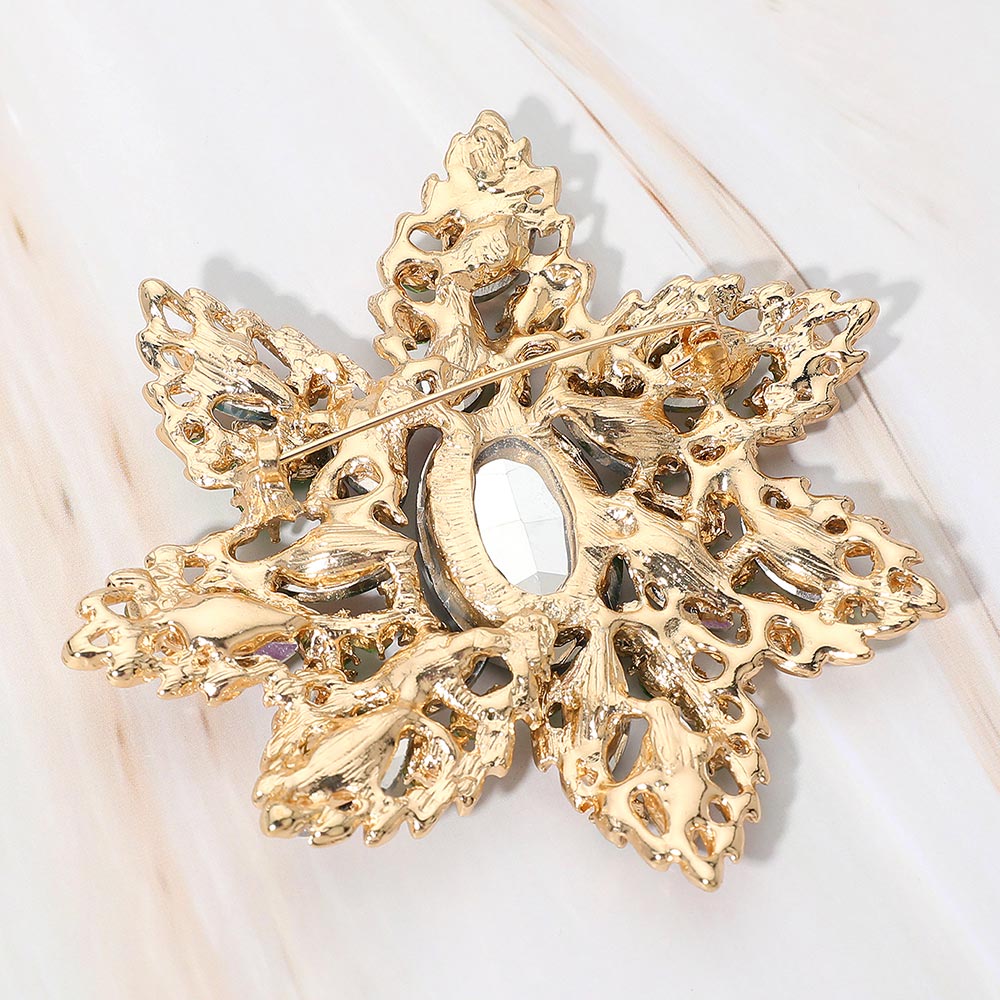 Oval Stone Center Rhinestone Studded Floral Statement Pin Brooch