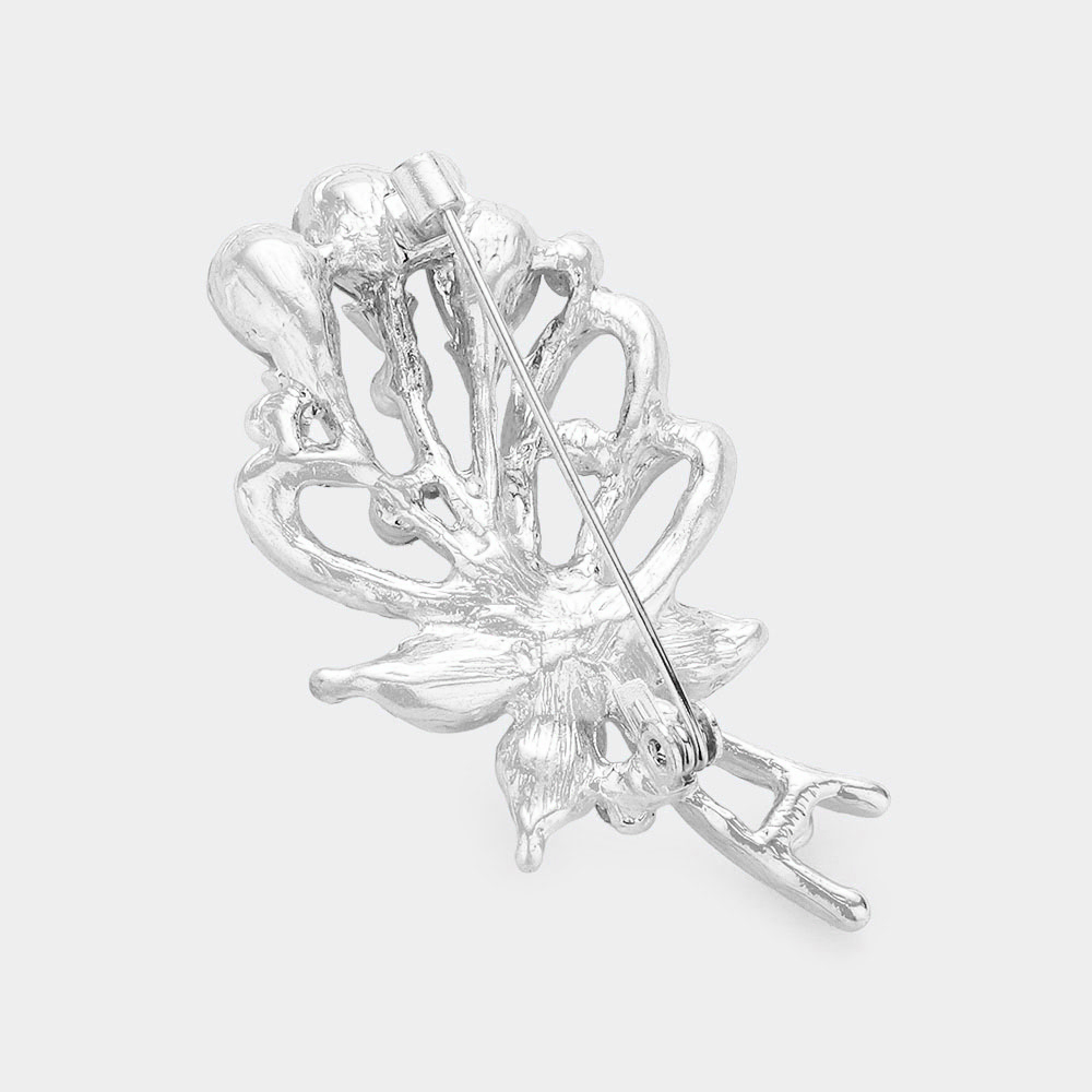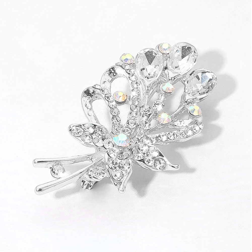 Details • Size : 2.2" X 1.2" • Pin Brooch • Elegant floral spray brooch featuring a sparkling crystal-inspired design with layered petal details and radiant accents. A refined statement accessory that adds vintage charm and eye-catching brilliance to jackets, dresses, scarves, bags, and special occasion styling. • Lead and Nickel Compliant