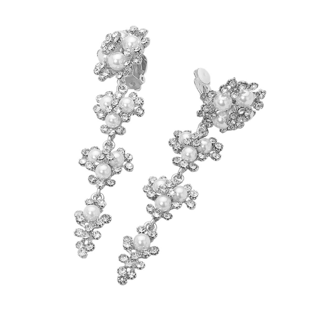 Floral Pearl Rhinestone Cluster Drop Evening Clip On Earrings