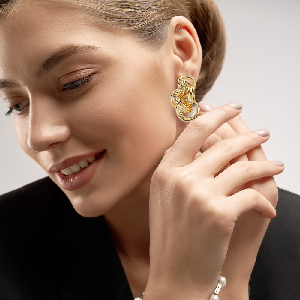 • These textured knot clip-on earrings blend modern artistry with timeless elegance. The intricate interwoven design adds depth and dimension, making them a chic statement piece for any occasion. Comfortable and stylish, they offer a polished finish without the need for piercings.