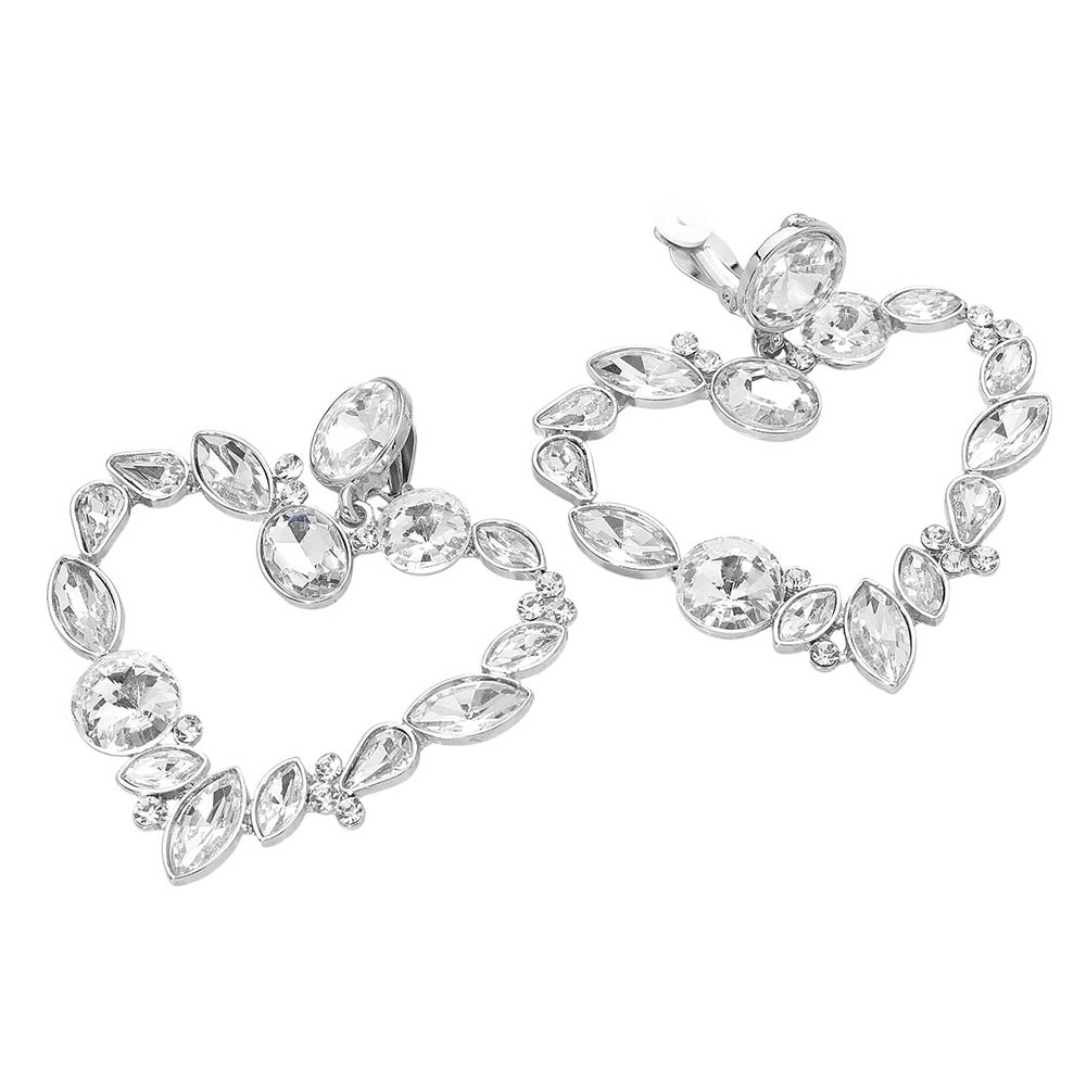• These statement clip earrings feature a bold open-heart design accented with faceted crystals for eye-catching shine. Crafted to deliver dramatic impact without pierced ears, they offer secure clip-on comfort and elevated style. Ideal for special events, parties, or glam styling, these hoops bring instant polish and standout appeal to any jewelry collection while remaining lightweight and easy to wear.