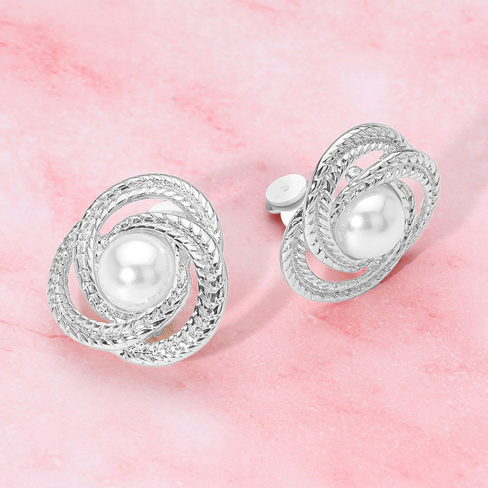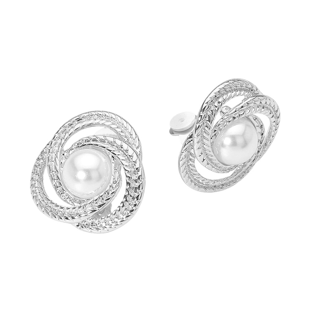 Details • Size : 1.4" X 1.4" • Clip On • Discover stunning clip-on earrings featuring a central faux pearl surrounded by an intricate, knot-like double band design. Perfect for adding a touch of timeless sophistication and sparkle to any outfit or special occasion. Enjoy secure, comfortable, and beautiful jewelry without piercings. • Lead and Nickel Compliant