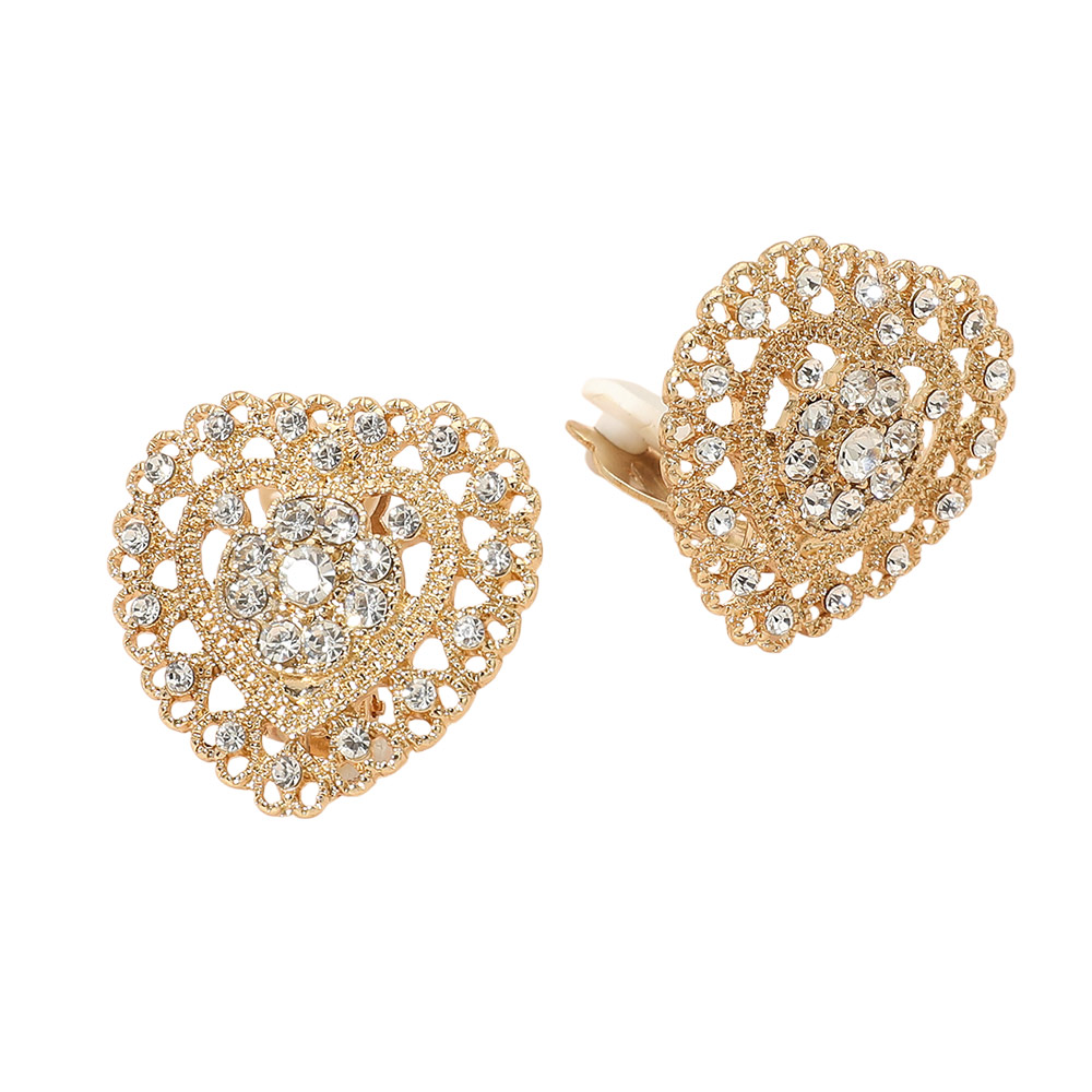 Details • Size : 1.2" X 1.2" • Clip On • Elevate everyday and special occasion looks with these heart shape clip earrings featuring intricate openwork and sparkling accent details. Designed for comfortable wear without piercings, they offer timeless charm and eye-catching shine. A perfect boutique accessory for romantic styles, gifts, and elegant statement looks. • Lead and Nickel Compliant