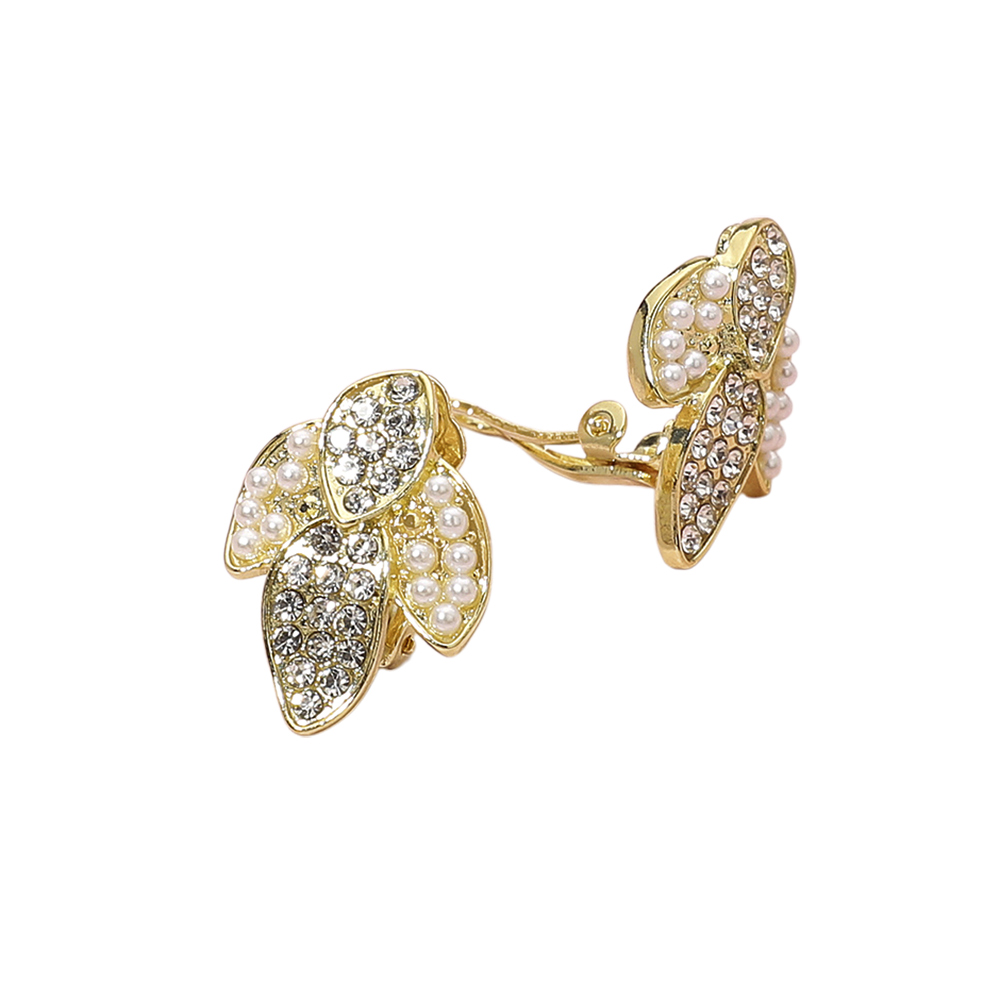 Details • Size : 0.75" X 0.8" • Clip On • Shine with sophistication in these leaf-shaped clip-on earrings adorned with clusters of pearls and dazzling crystals. Their graceful design brings a touch of natural elegance and sparkle to any outfit while offering a comfortable, pierced-free wear for all occasions. • Lead and Nickel Compliant