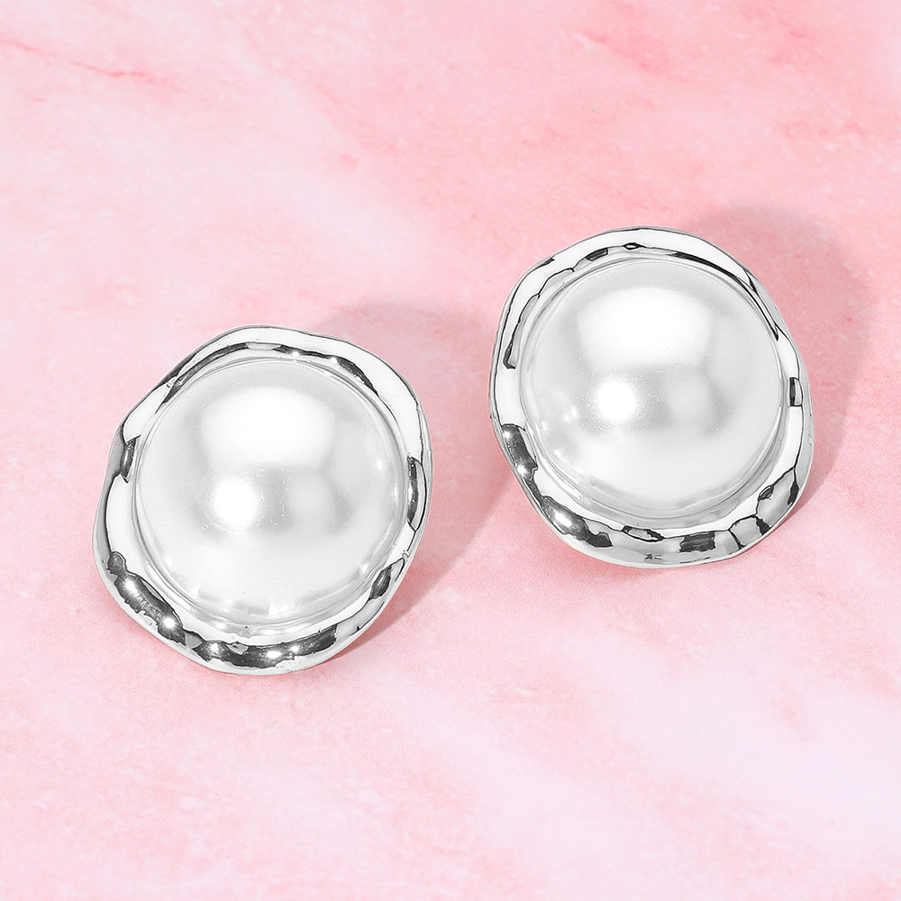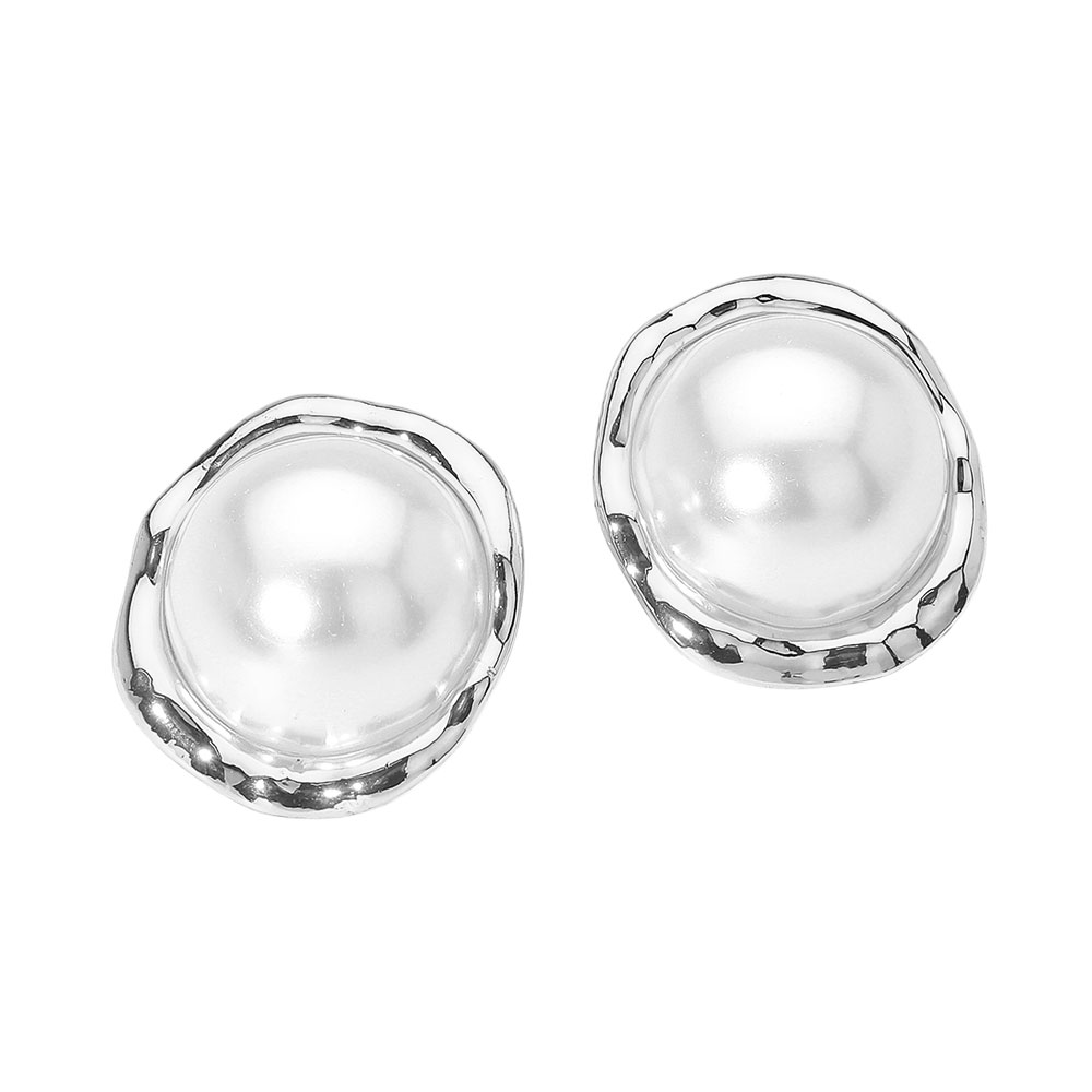 Details • Size : 1.25" X 1.25" • Clip On • Elegant round pearl dome clip-on earrings featuring a smooth polished center framed by an organic textured border. Designed for comfort without pierced ears, these timeless statement studs add a refined touch to both casual and dressy looks. • Lead and Nickel Compliant