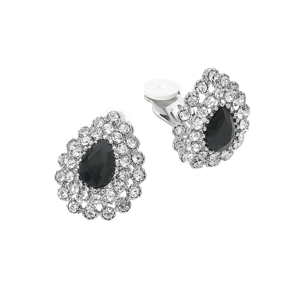 Details • Size : 0.75" X 1" • Clip On • Crystal teardrop cluster clip earrings featuring a classic halo-inspired design that adds instant elegance to any look. Designed for comfortable, secure wear without piercings, perfect for special occasions or elevated everyday styling. Ideal for boutiques seeking timeless, dressy statement earrings with refined appeal. • Lead and Nickel Compliant