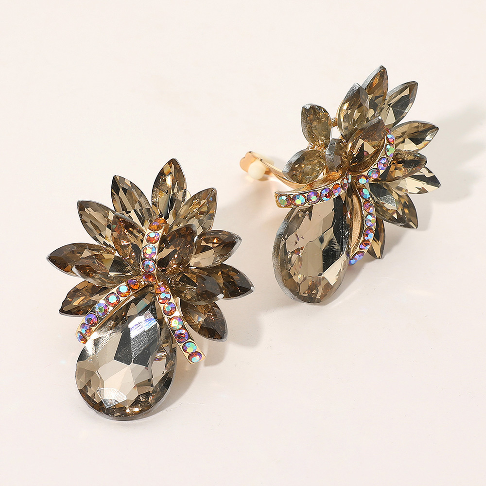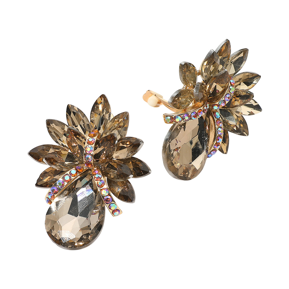 Details • Size : 1.75" X 2.25" • Clip On • Stunning clip-on earrings designed with a leaf cluster arrangement and dazzling crystal accents. These bold statement earrings add a glamorous touch to any outfit, perfect for parties, weddings, and evening events where timeless sophistication meets modern sparkle.