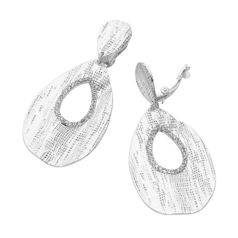 Details • Size : 1.5" X 3.1" • Clip On • Elevate any outfit with these textured teardrop clip-on earrings featuring an open-center design outlined in sparkling accents. Their sculptural shape adds modern elegance and bold flair, making them a standout accessory for both special events and stylish everyday looks. • Lead and Nickel Compliant