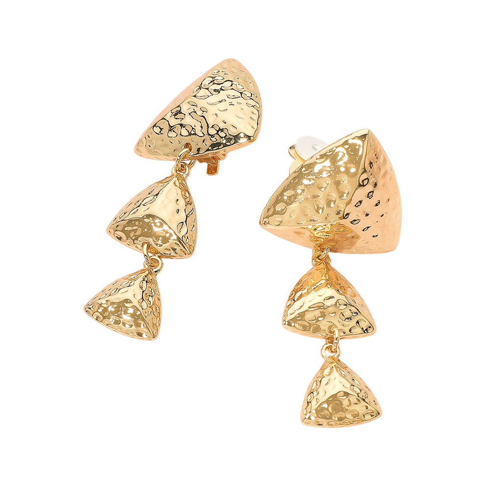 Details • Size : 1.2" X 2.8" • Clip On • These hammered triple-drop clip-on earrings offer a bold sculptural look with dimensional shapes that move gracefully. Their striking design adds texture and modern flair, making them a standout accessory for elevating everyday or evening outfits. • Lead and Nickel Compliant
