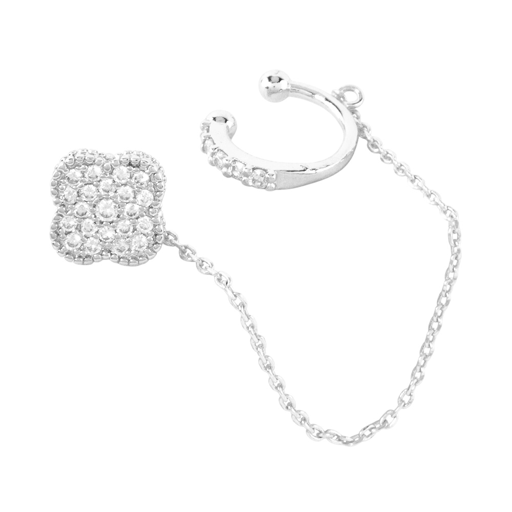 Details • Size : 0.8" X 2.2" • This white gold-dipped chain earring features a sparkling clover charm linked to a sleek ear cuff, offering a chic and elegant design. Adorned with cubic zirconia and crafted with hypoallergenic sterling silver posts, it’s a modern accessory perfect for effortless sophistication. • Lead and Nickel Compliant • Hypoallergenic • Made In Korea • Gold Dipped • CZ Cubic Zirconia • Sterling Silver Post
