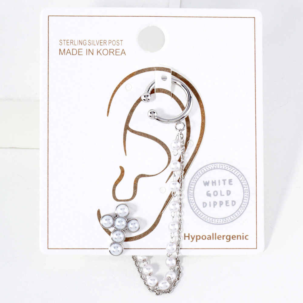 White Gold Dipped Pearl Cross Chain Ear Cuff Earrings