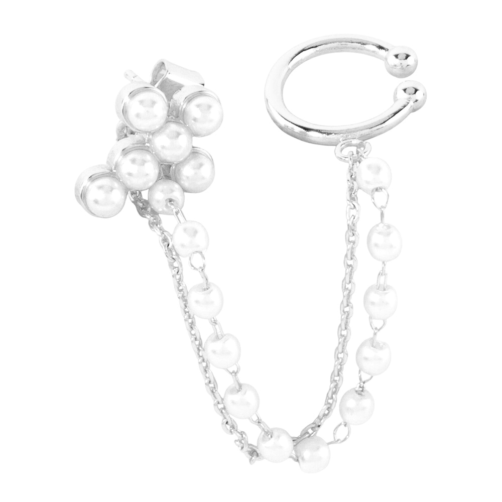 • This elegant white gold-dipped chain earring showcases a cluster of luminous pearls connected to a matching ear cuff by dual pearl-accented chains. Crafted with hypoallergenic sterling silver posts, it combines timeless grace and modern sophistication, perfect for both casual and formal wear.
