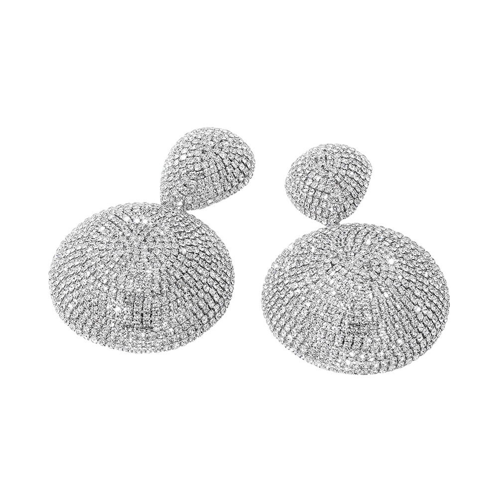 • Bold pavĂ© dome drop earrings featuring a sculptural rounded silhouette with layered sparkle. Designed to reflect light from every angle, this statement style adds dramatic elegance to evening wear, special occasions, and elevated boutique assortments while remaining timeless and versatile.