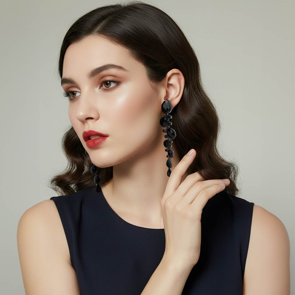 • These statement crystal drop dangle earrings feature an elongated silhouette with layered teardrop accents for dramatic movement and shine. Designed to elevate evening looks, special occasions, and event styling, they offer eye-catching elegance for boutiques, gift selections, and fashion-forward customers seeking bold yet refined accessories.