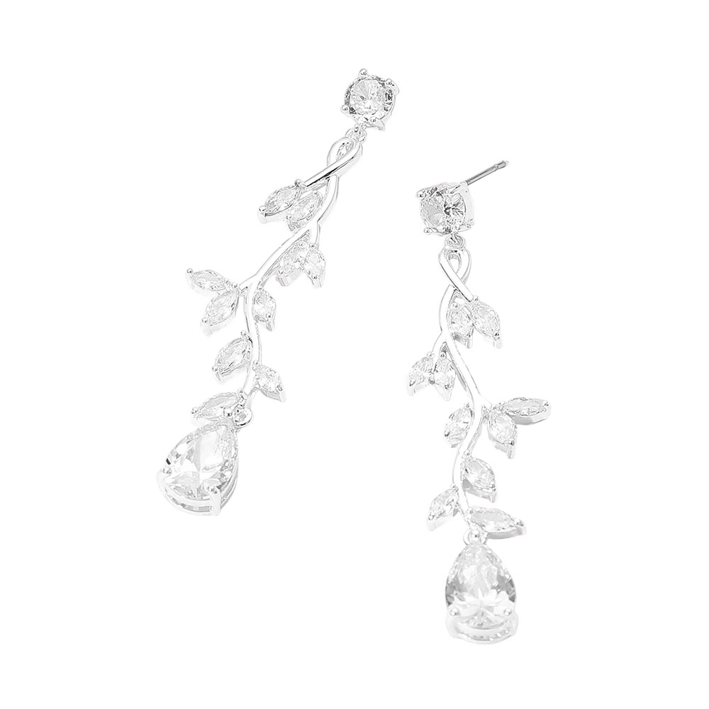Details • Size : 0.7" X 2.5" • Post Back • These elegant drop earrings feature a delicate vine-inspired design adorned with sparkling cz crystal accents. Perfect for weddings, formal events, or special evenings, they offer a refined touch of glamour and grace that enhances any outfit with timeless sophistication and shimmer. • CZ Cubic Zirconia • Lead and Nickel Compliant