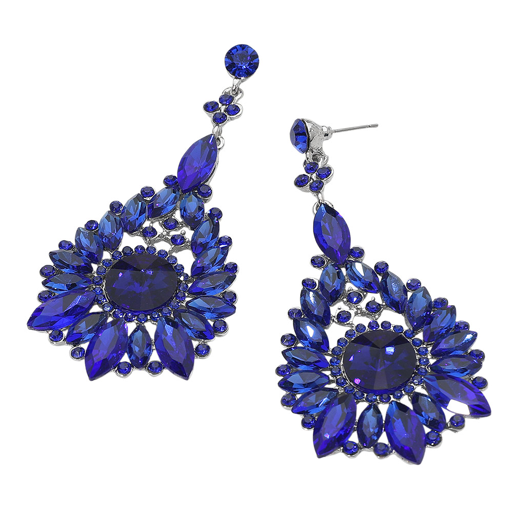 Details • Size : 1.6" X 3.7" • Post Back • Make an unforgettable impression with these statement teardrop crystal earrings. Designed with intricate faceted stones in a radiant arrangement, they capture light beautifully for a luxurious look—perfect for evening events, weddings, and glamorous nights out.
