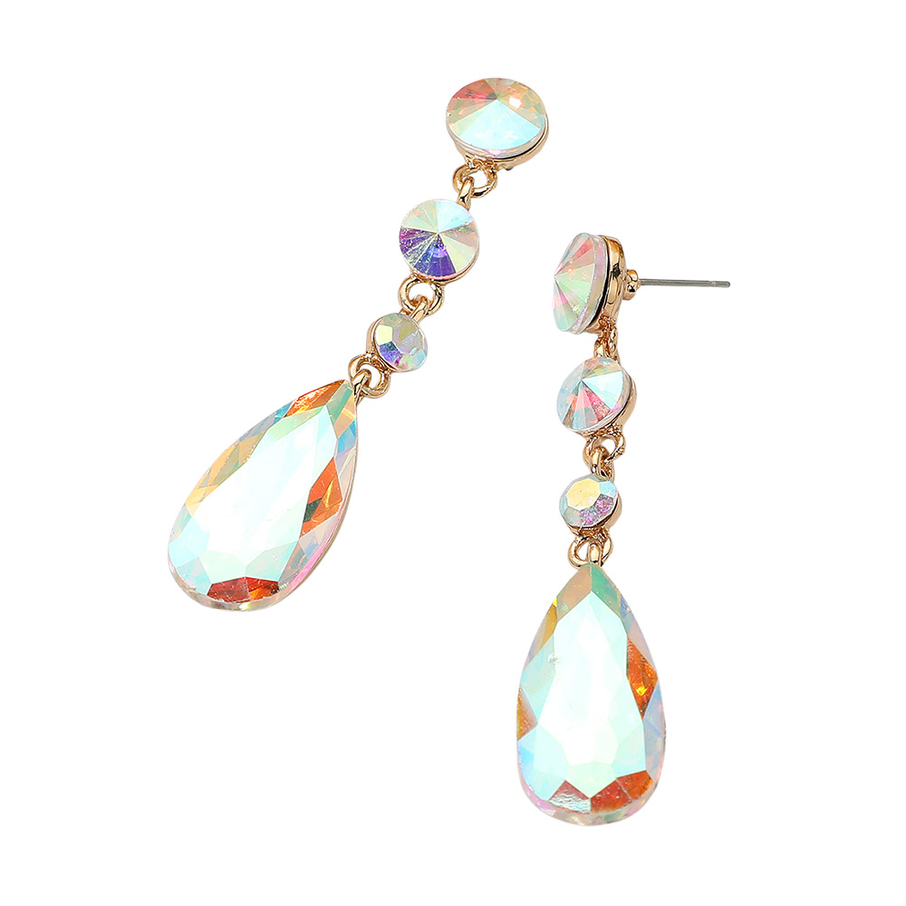 • Make a glamorous statement with these elegant Multi-Faceted Dangle Earrings. Each earring features a brilliant, large pear-shaped crystal suspended below a line of three smaller, round, sparkling gems. The stones possess a spectacular iridescent shimmer that shifts in the light, displaying a captivating play of different hues. Set in a slim metallic drop design, these earrings offer striking length and sparkle, making them the perfect choice for formal events, weddings, proms, or any occasion requiring a touch of sophisticated glamour.