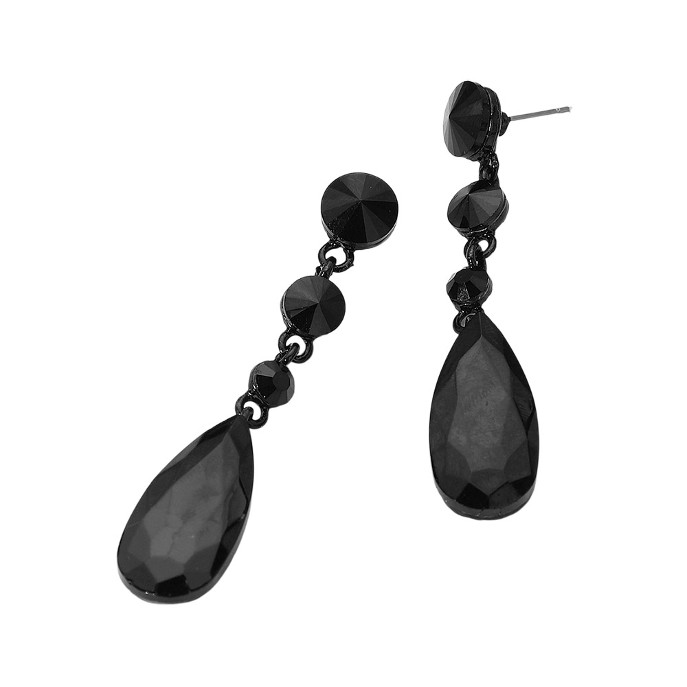 Details • Size : 0.6" X 2.7" • Post Back • Make a glamorous statement with these elegant Multi-Faceted Dangle Earrings. Each earring features a brilliant, large pear-shaped crystal suspended below a line of three smaller, round, sparkling gems. The stones possess a spectacular iridescent shimmer that shifts in the light, displaying a captivating play of different hues. Set in a slim metallic drop design, these earrings offer striking length and sparkle, making them the perfect choice for formal events, weddings, proms, or any occasion requiring a touch of sophisticated glamour. • Lead and Nickel Compliant