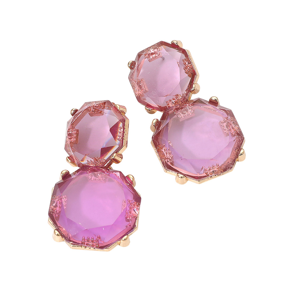 • These faceted double gem drop earrings feature a striking octagonal design that reflects light with every movement. Their elegant, layered silhouette adds a refined touch, making them a standout accessory for both casual and formal occasions.