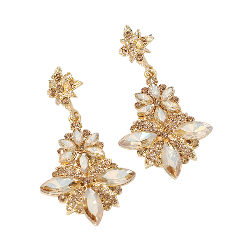 • Radiate elegance with these floral crystal drop earrings featuring a stunning cluster of faceted stones in a dazzling flower design. Ideal for weddings, galas, or celebrations, these statement earrings add a glamorous finishing touch to elevate your evening or bridal look.