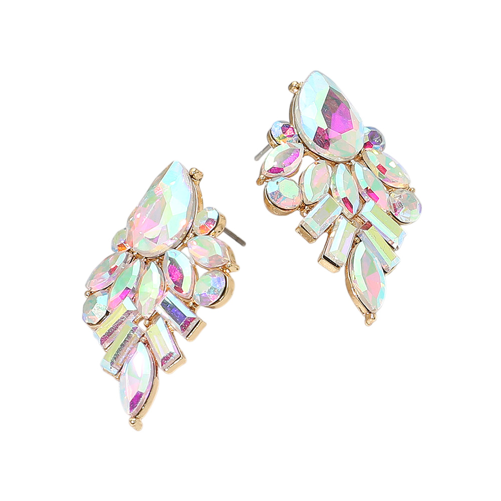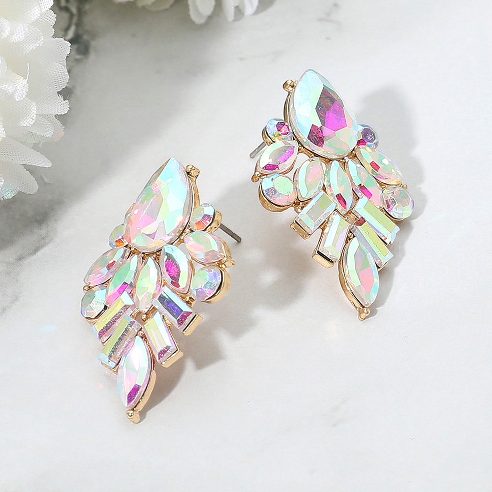 Details • Size : 1" X 1.4" • Post Back • Shine brilliantly with these radiant cluster stud earrings, designed with an array of faceted crystals in teardrop, oval, and baguette cuts. Their intricate arrangement adds a touch of glamour, making them the perfect accessory for special occasions or elevating your everyday chic look. • Lead and Nickel Compliant