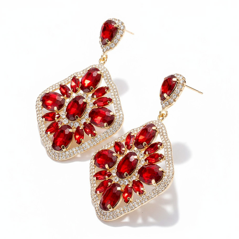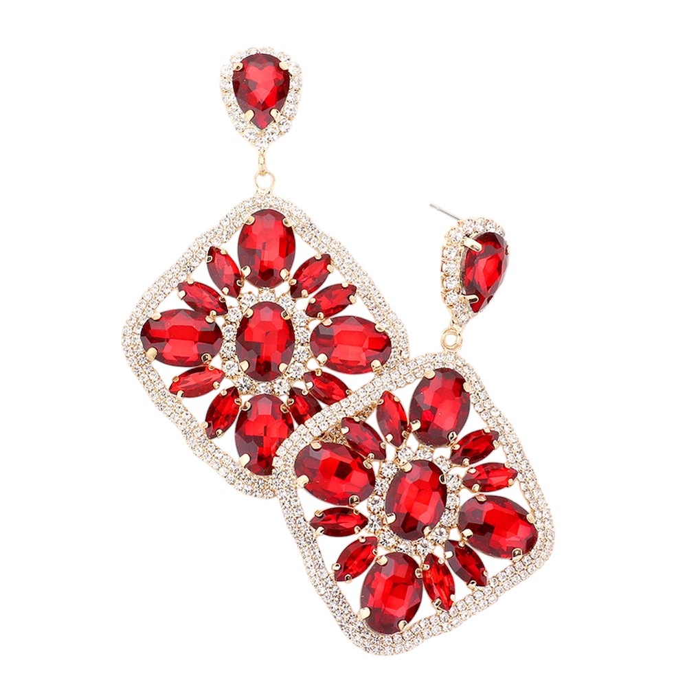 Oversized Glass Stone Embellished Diamond Frame Chandelier Evening Earrings