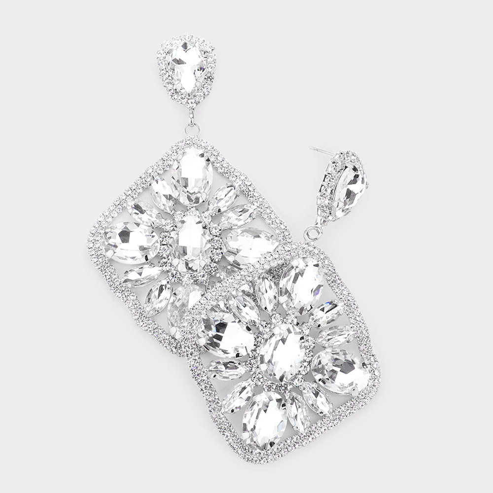 Oval Marquise Stone Cluster Accented Rhinestone Rhombus Dangle Evening Earrings