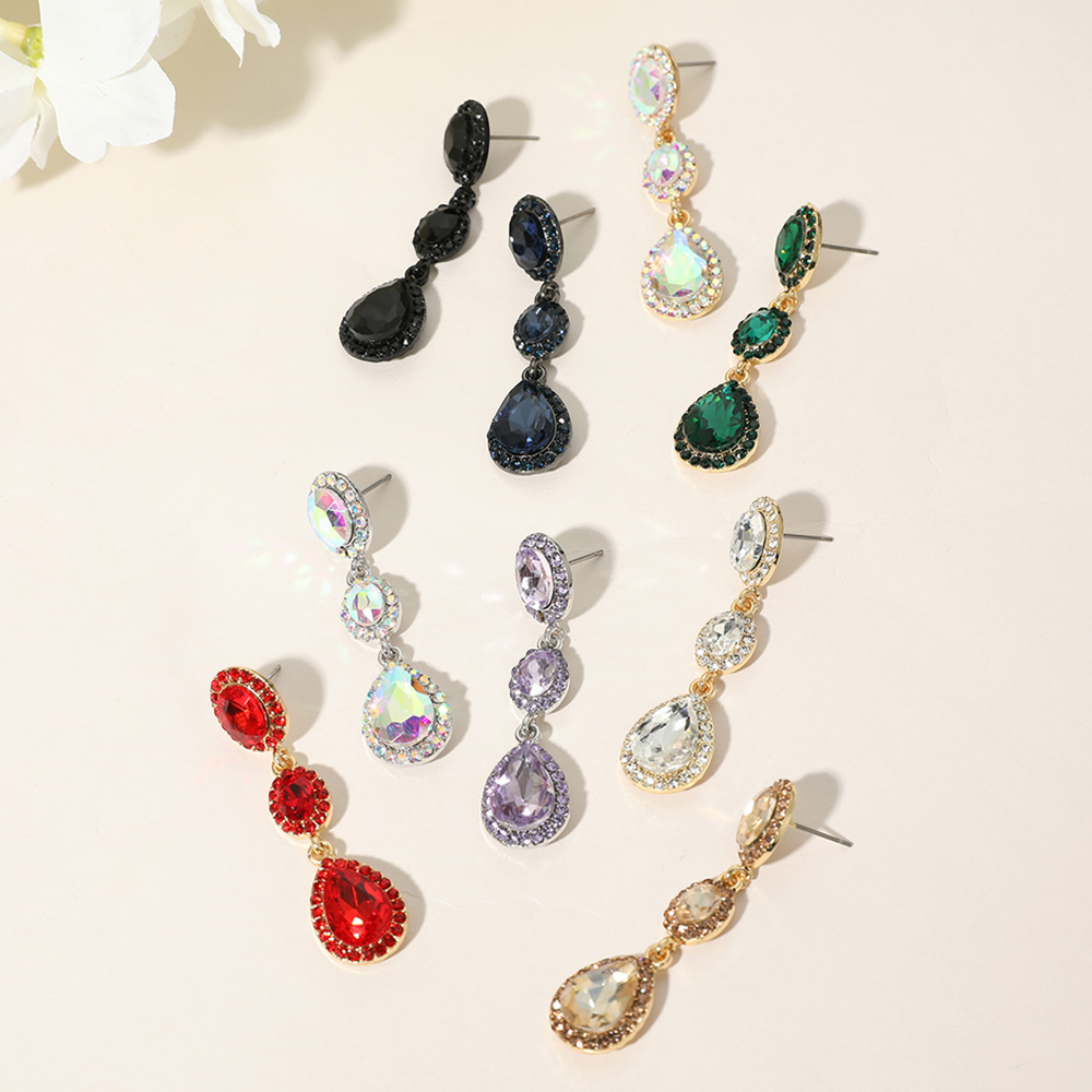 Details • Size : 0.6" X 2.1" • Post Back • Shine bright with these triple teardrop crystal drop earrings featuring dazzling stones in a cascading design. Perfect for weddings, galas, or nights out, they add refined sparkle and timeless elegance to any outfit, effortlessly elevating your look with radiant sophistication. • Lead and Nickel Compliant