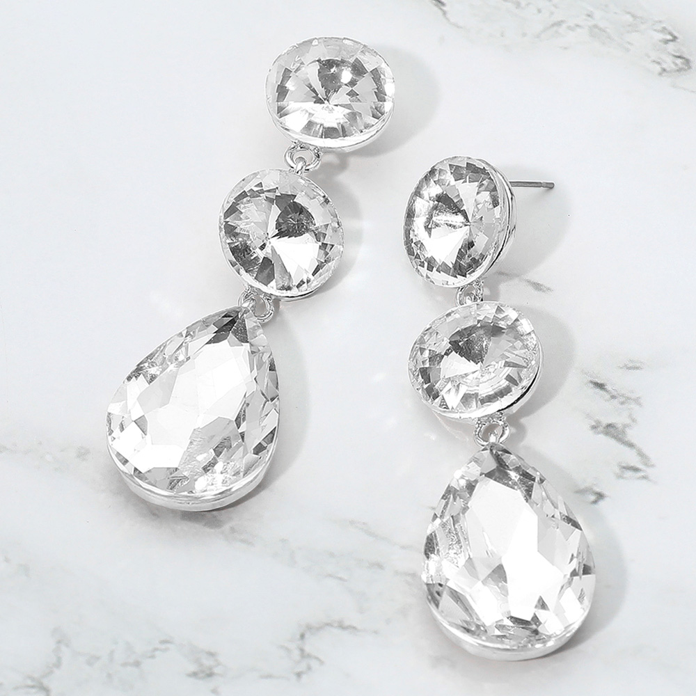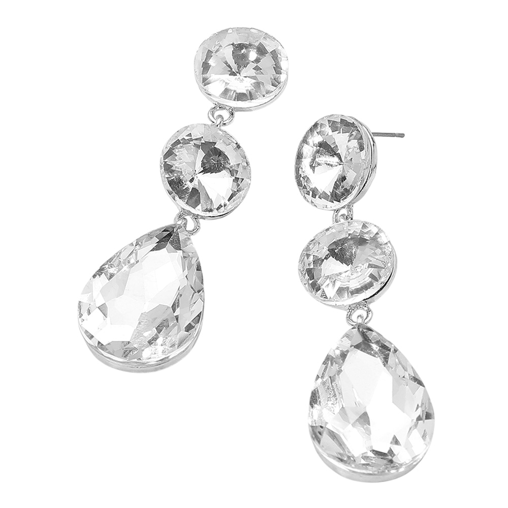 Details • Size : 0.8" X 2.8" • Post Back • Bold teardrop dangle earrings with faceted stones and round stud accents. Designed for a striking, glamorous touch, these earrings are ideal for evening events, weddings, or adding sparkle to any special occasion. • Lead and Nickel Compliant