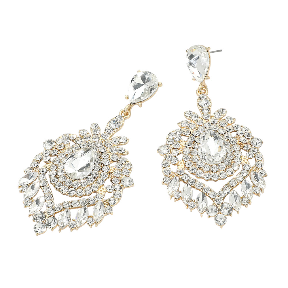 • These statement crystal drop chandelier earrings feature an intricate layered design with faceted accents that catch the light from every angle. Designed to elevate evening looks, weddings, and special events, they add bold sparkle and refined glamour while remaining comfortable to wear. A striking accessory that instantly enhances dresses, formal outfits, or party-ready styles.