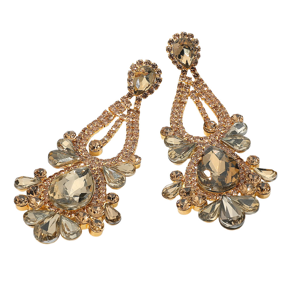 Details • Size : 1.5" X 3.1" • Post Back • Turn heads with these iridescent teardrop statement earrings, featuring a dazzling arrangement of shimmering stones and intricate detailing. Perfect for parties, weddings, and glamorous occasions, these earrings add a bold touch of sparkle and sophistication to any elegant look. • Lead and Nickel Compliant