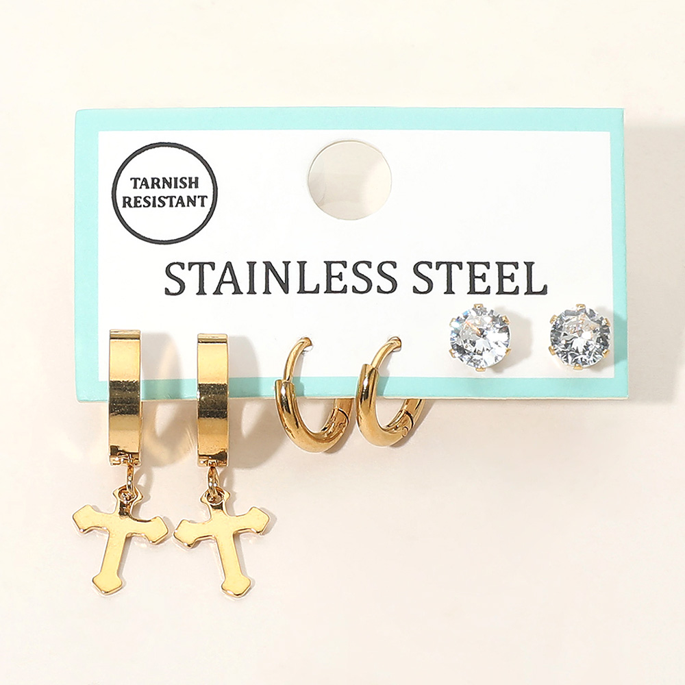 3Pairs - Stainless Steel Cross Charm Huggie Hoop Stone Stud Earring Set 3Pairs - Stainless Steel Cross Charm Huggie Hoop Stone Stud Earring Set