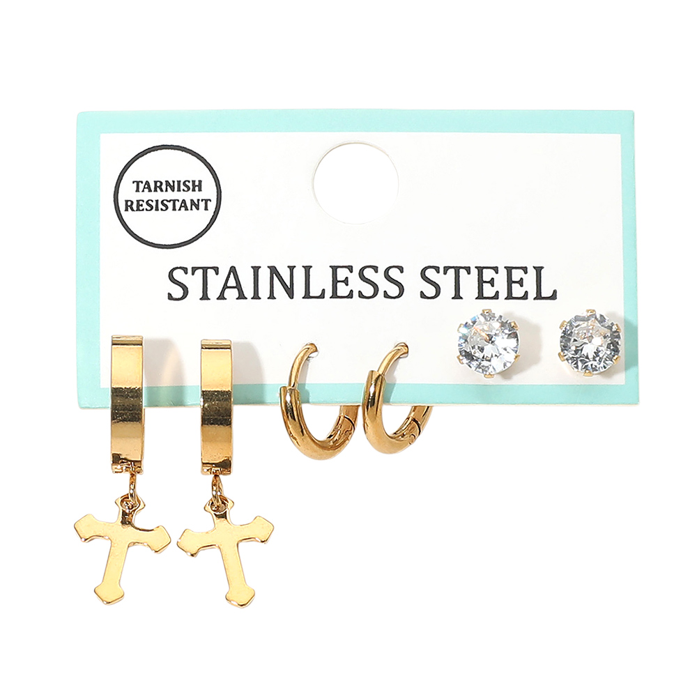 3Pairs - Stainless Steel Cross Charm Huggie Hoop Stone Stud Earring Set