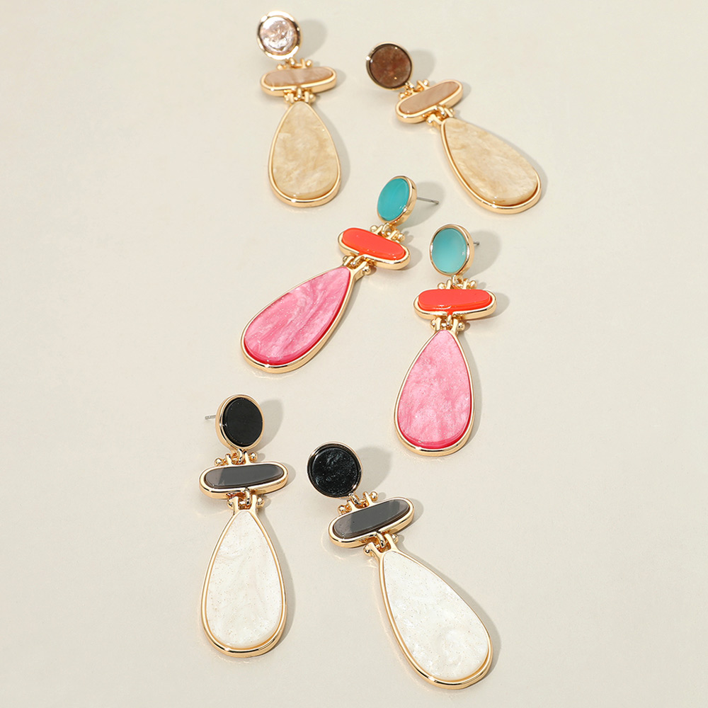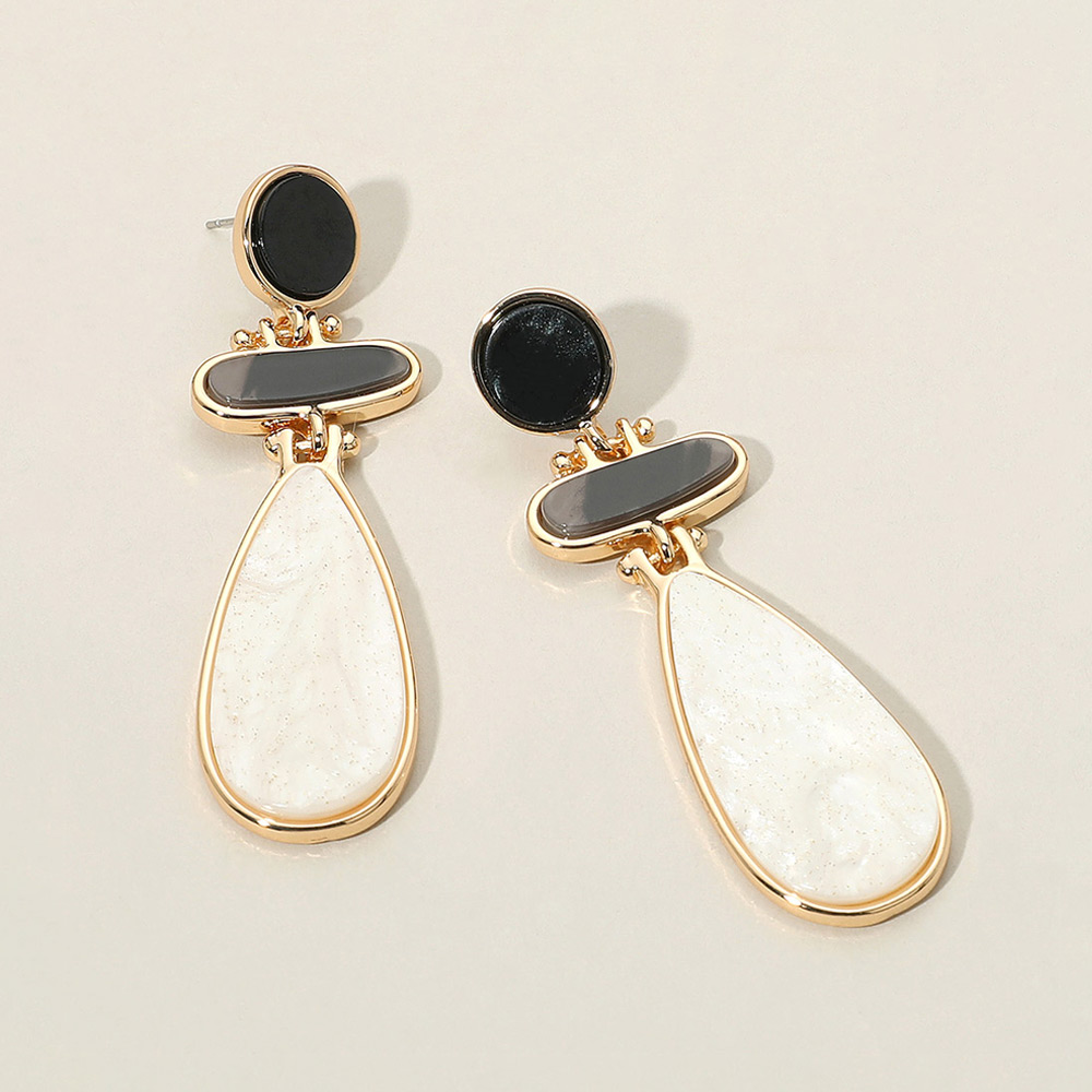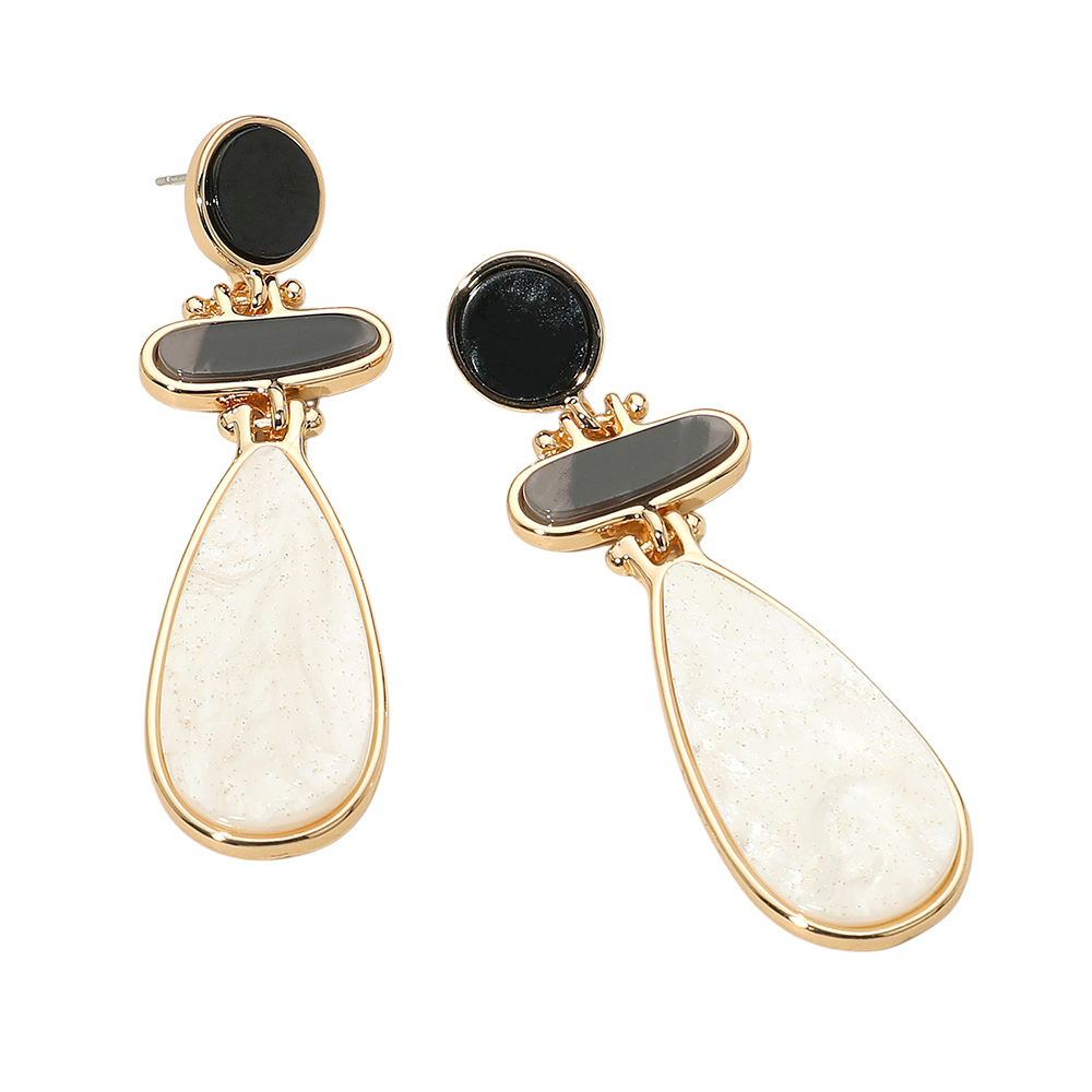 Details • Size : 0.8" X 2.8" • Post Back • Elegant teardrop dangle earrings featuring a layered stone design with contrasting shapes. Crafted with a sleek finish, these earrings bring modern sophistication to both casual and formal outfits, offering a statement-making accessory for any occasion. • Lead and Nickel Compliant