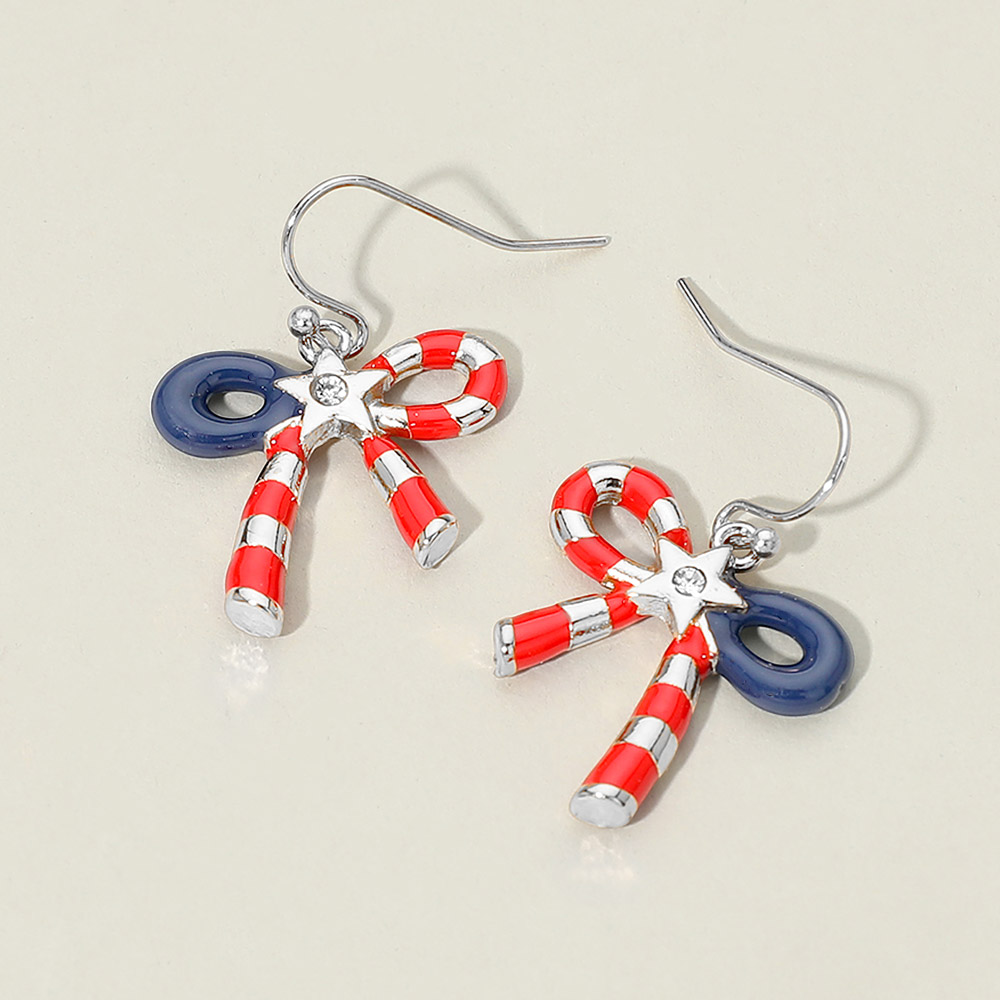 Details • Size : 0.8" X 1.25" • Fish Hook Back • Add festive charm with these patriotic candy cane bow drop earrings featuring a playful ribbon design and star accent. Lightweight and easy to style, they’re perfect for holidays, parades, themed events, and seasonal displays. A fun statement accessory ideal for boutique collections and giftable USA-inspired jewelry selections. • Lead and Nickel Compliant