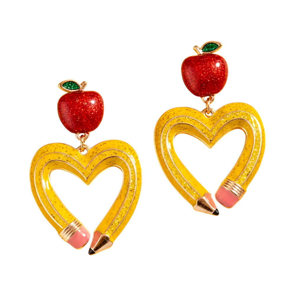 Details • Size : 1.2" X 1.75" • Titanium Post Back • Playful drop earrings featuring an apple charm paired with a heart-shaped pencil design for a school-inspired statement. Lightweight and fun, they elevate casual looks, themed outfits, classroom events, or gift ideas while remaining comfortable for all-day wear. • Hypoallergenic • Lead and Nickel Compliant