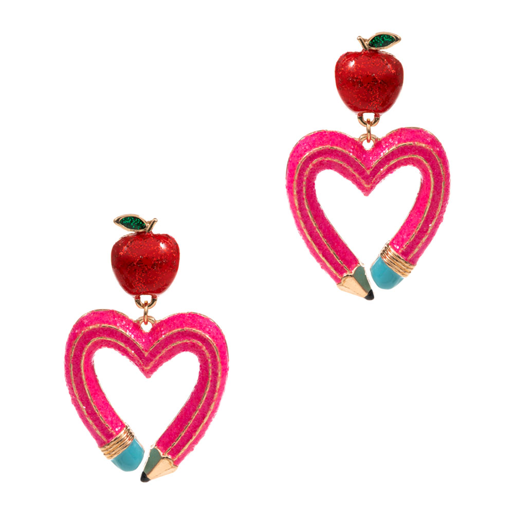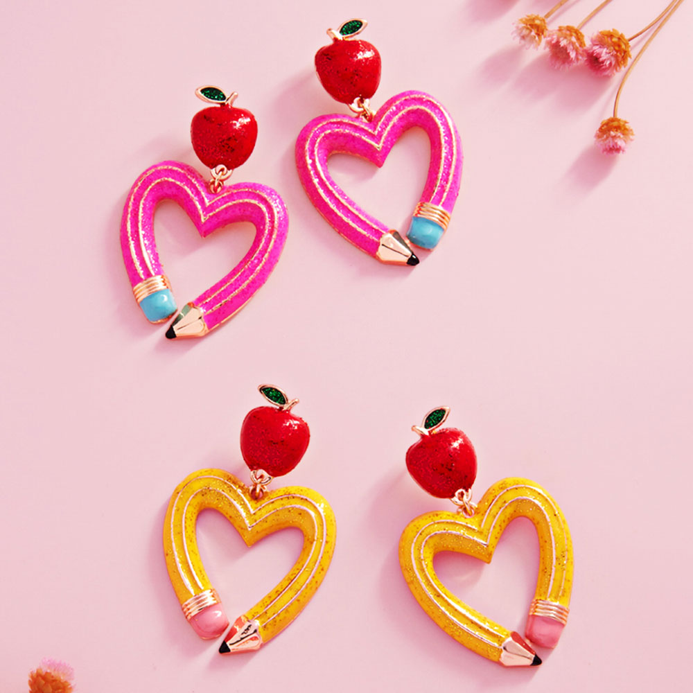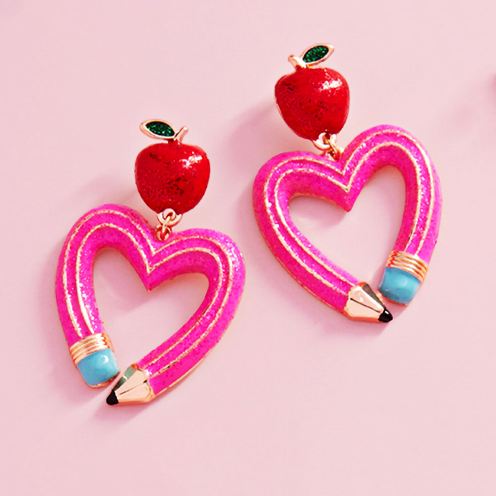 • Playful drop earrings featuring an apple charm paired with a heart-shaped pencil design for a school-inspired statement. Lightweight and fun, they elevate casual looks, themed outfits, classroom events, or gift ideas while remaining comfortable for all-day wear.