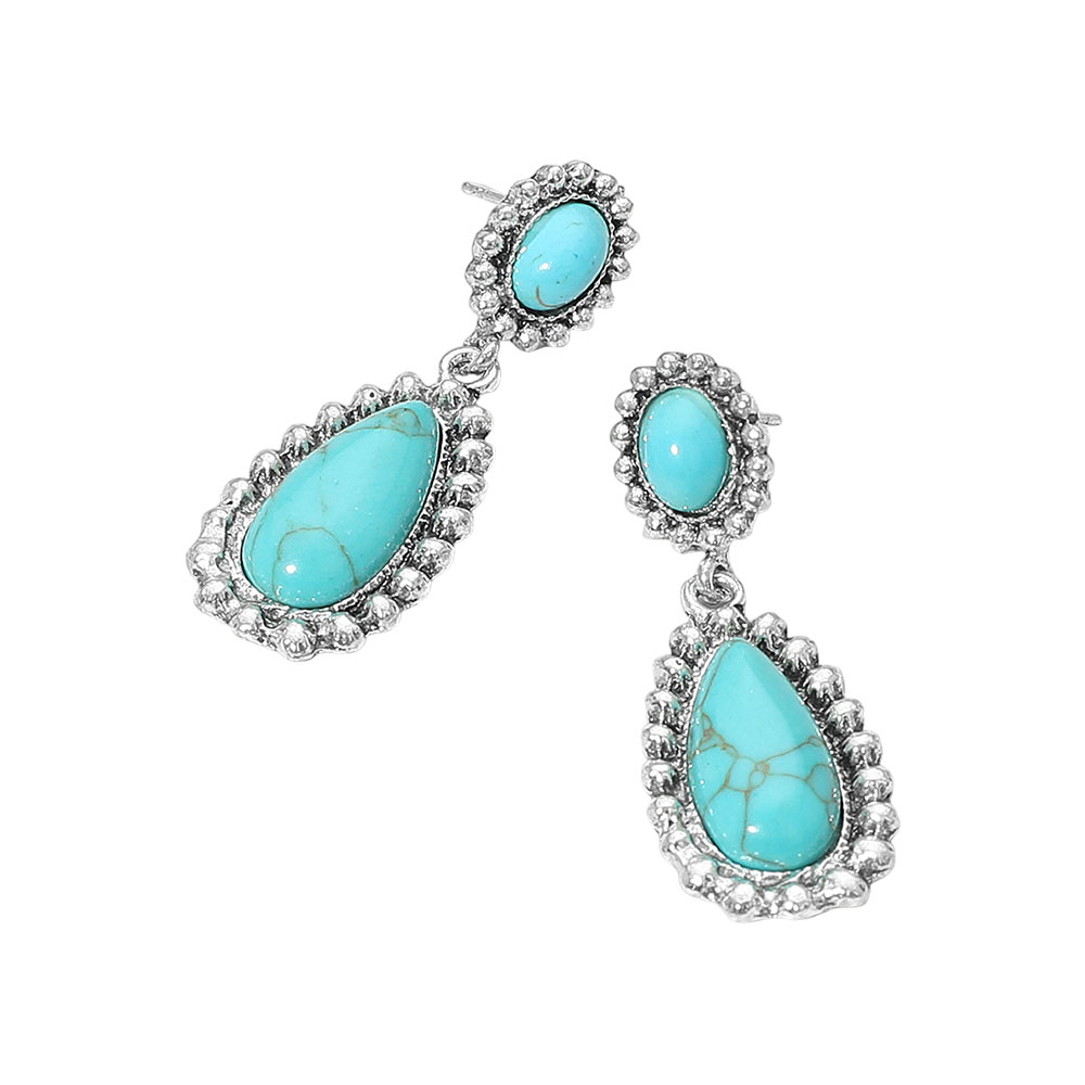 Details • Size : 0.7" X 1.6" • Post Back • These teardrop double stone statement earrings feature a layered design framed by intricate beaded detailing. Their elegant silhouette and refined craftsmanship make them perfect for elevating both casual and formal outfits, offering timeless charm and a sophisticated boho appeal. • Lead and Nickel Compliant