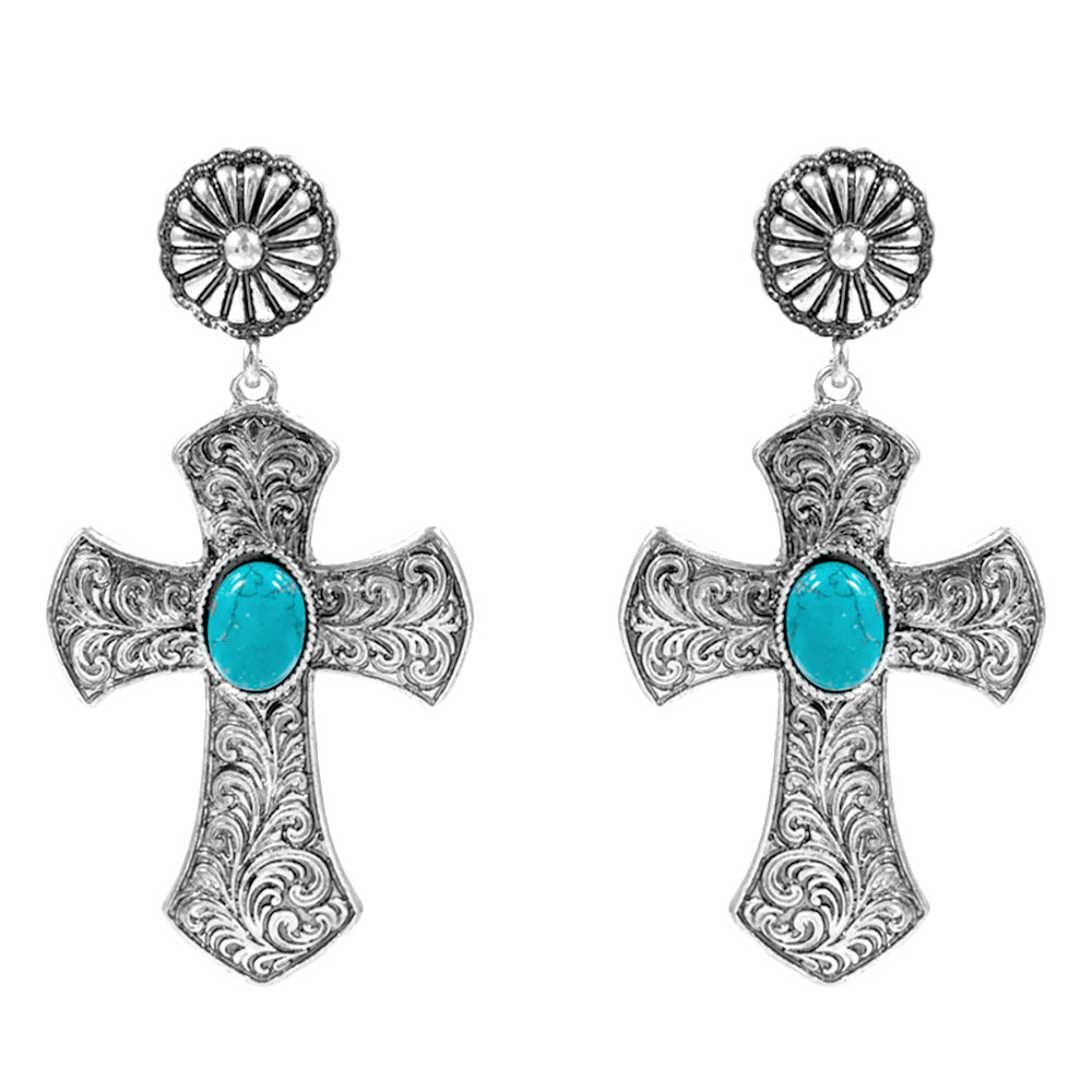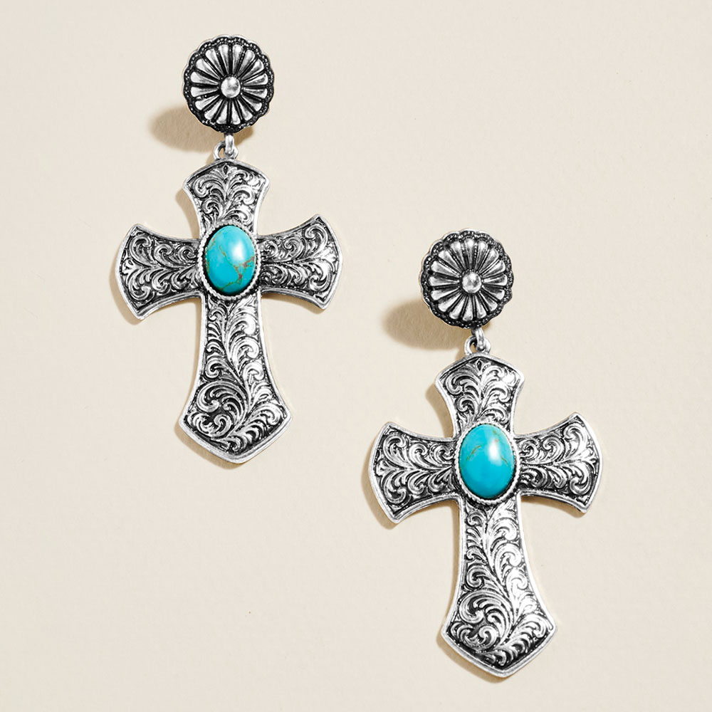Details • Size : 1.25" X 2.6" • Titanium Post Back • Statement western-inspired cross dangle earrings with ornate detailing and bold silhouette designed to elevate everyday outfits, festival looks, and themed styling. Eye-catching yet versatile, perfect as a distinctive accessory or a memorable gift for lovers of expressive jewelry. • Hypoallergenic • Lead and Nickel Compliant