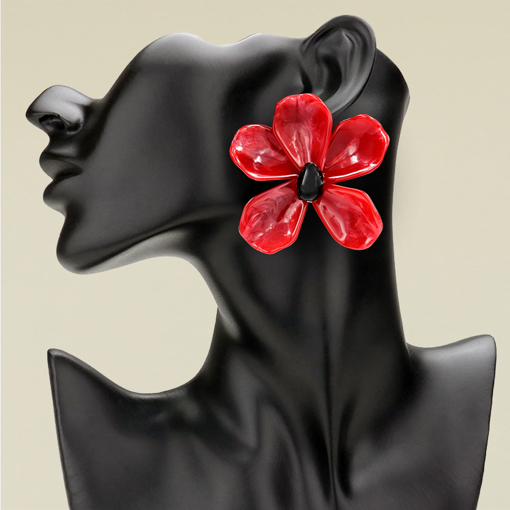 Details • Size : 2.5" X 2.5" • Post Back • Bold statement earrings featuring large petal-shaped floral design with glossy finish. Perfect for elevating any outfit, these eye-catching earrings add a touch of artistic flair and elegance, ideal for special occasions, photoshoots, or standout fashion looks. • Lead and Nickel Compliant