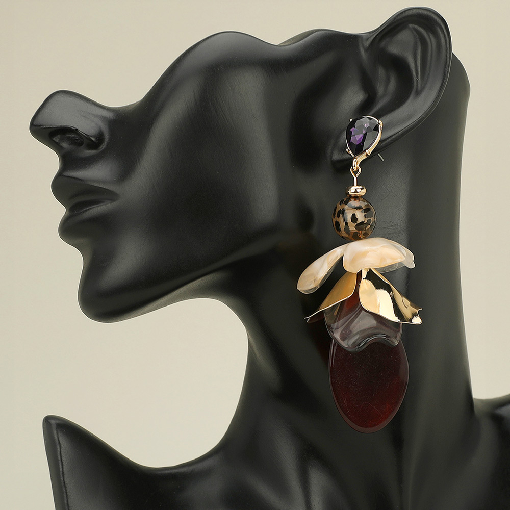 Details • Size : 1.5" X 4" • Post Back • These floral statement drop earrings feature layered petal-inspired details with a bold mix of textures and tones. Finished with a sparkling stud accent, they create a dramatic yet elegant look—perfect for adding a standout touch to evening outfits or special occasions. • Lead and Nickel Compliant