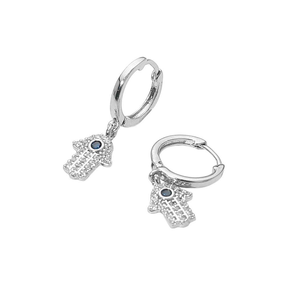 Details • Size : 0.5" X 1" • Huggie Back • Elegant hoop earrings featuring a dangling hamsa charm, a symbol of protection, luck, and positive energy. Accented with sparkling details, these versatile earrings bring both style and meaning, making them perfect for daily wear, layering with other jewelry, or gifting as a thoughtful accessory. • Brass • CZ Cubic Zirconia • Lead and Nickel Compliant