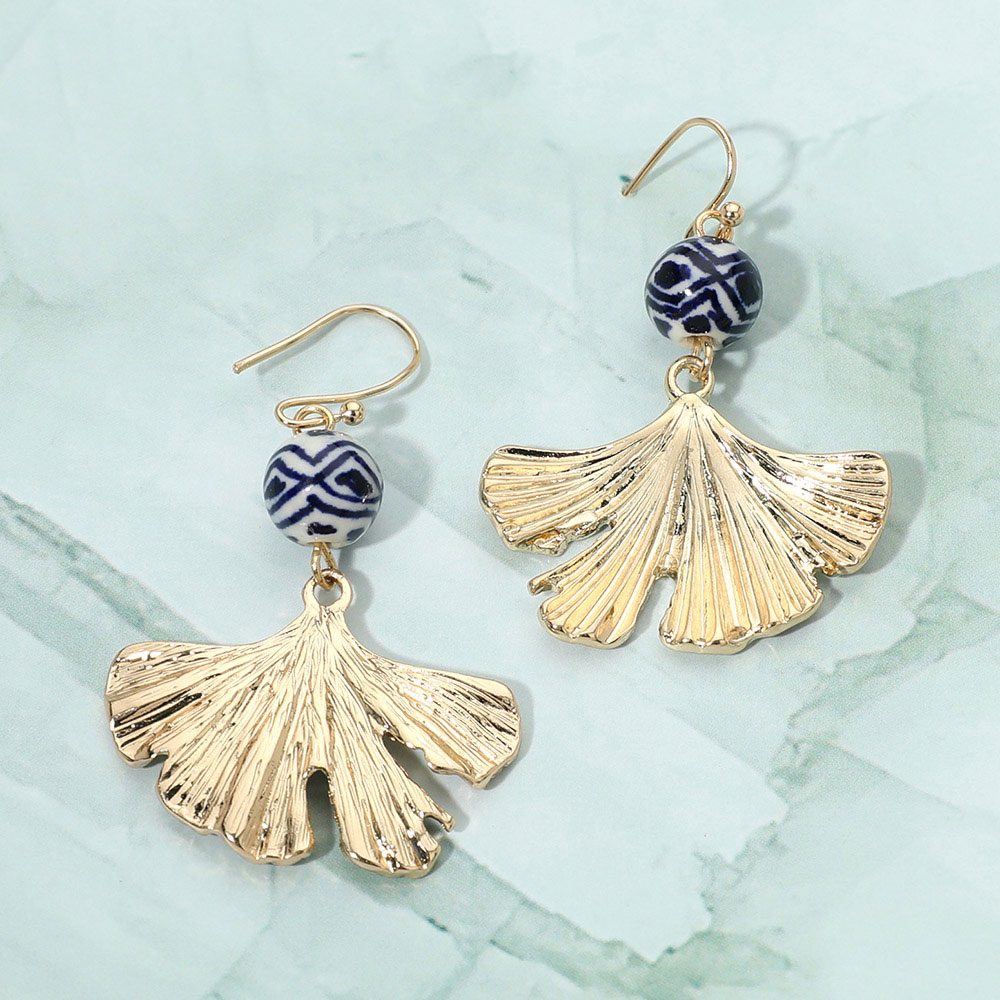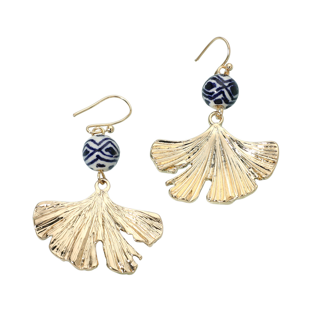 Ceramic Ball Textured Metal Ginko Leaf Drop Earrings