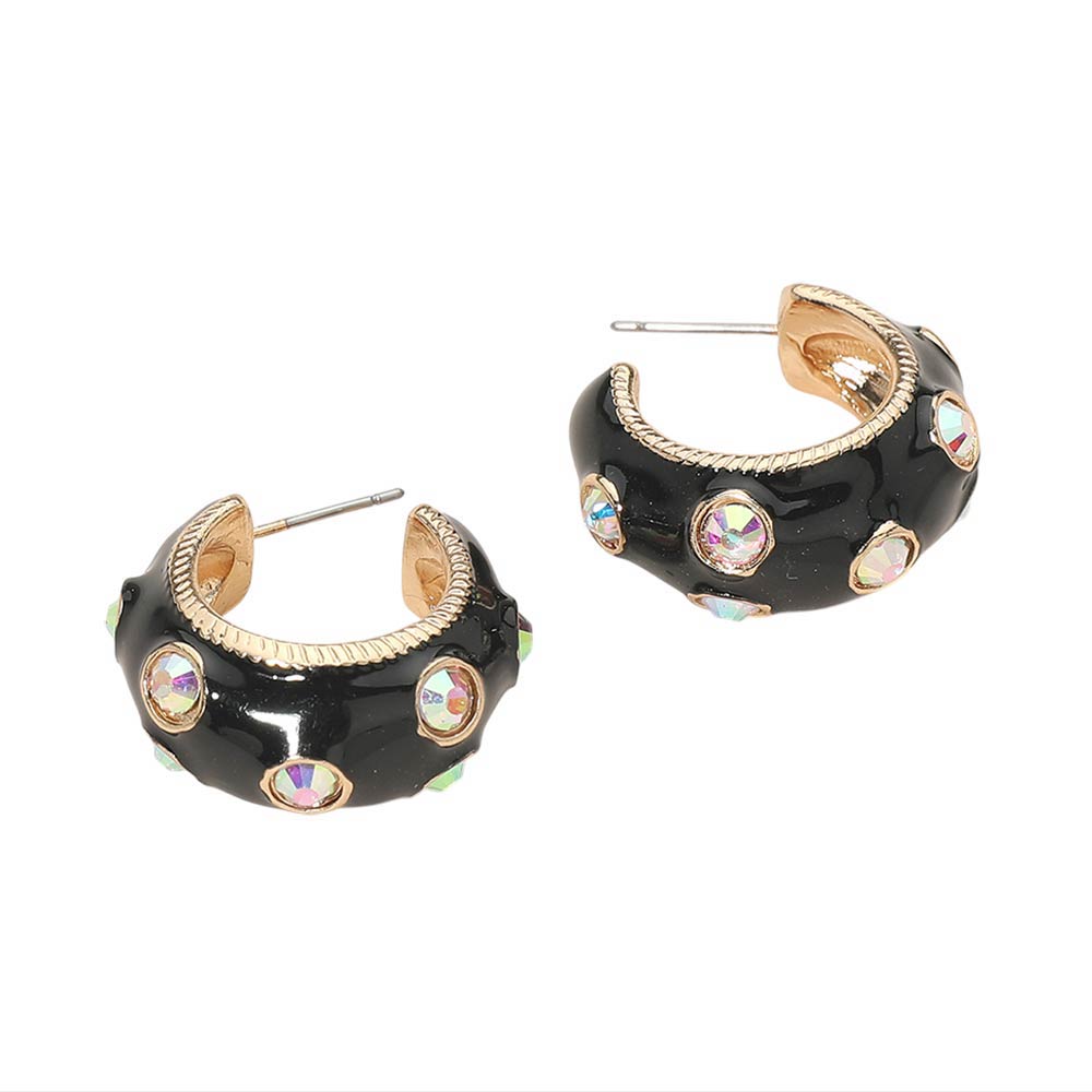 • Bold huggie hoop earrings designed with raised detailing and sparkling accent elements for a standout statement look. The compact hoop shape offers comfortable wear while adding eye catching texture and shine. Ideal for boutique collections, trend driven styling, gifting, and special occasions. A modern accessory that elevates everyday outfits with confident, fashion forward appeal.