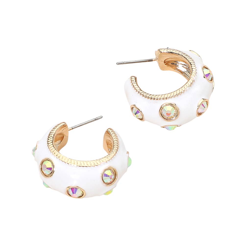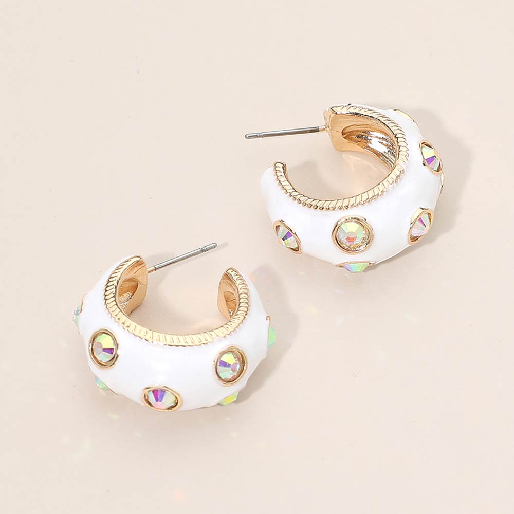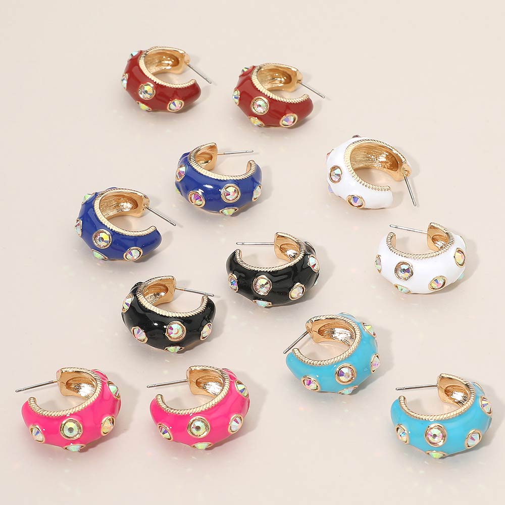• Bold huggie hoop earrings designed with raised detailing and sparkling accent elements for a standout statement look. The compact hoop shape offers comfortable wear while adding eye catching texture and shine. Ideal for boutique collections, trend driven styling, gifting, and special occasions. A modern accessory that elevates everyday outfits with confident, fashion forward appeal.