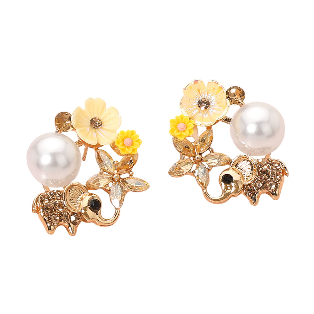 Details • Size : 1.25" X 1.25" • Post Back • Whimsical stud earrings featuring adorable elephant charms adorned with crystals, delicate floral details, and luminous pearl accents. A charming accessory that blends playful design with elegant sparkle, perfect for adding personality to casual or dressy looks. • Lead and Nickel Compliant